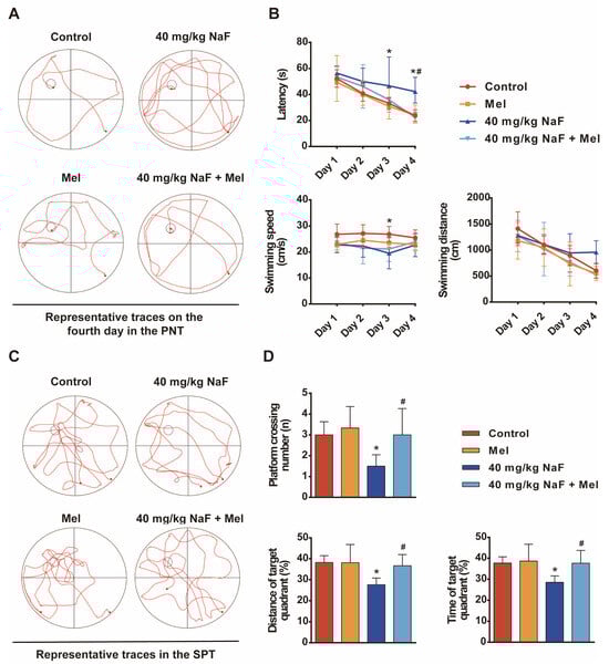 Network pharmacology is an emerging interdisciplinary methodology that integrates diverse technical tools to investigate drug–disease correlations and employs network visualization techniques to identify key molecular targets and core active components of drugs. To address the aforementioned knowledge gap, the present study aimed to explore Mel’s protective effect and its underlying molecular mechanism against fluoride-induced developmental brain injury. Based on this methodology, we established a perinatal sodium fluoride (NaF) exposure model with/without Mel intervention, employed network pharmacology approaches to predict key molecular targets of Mel for treating fluoride-induced nerve injury, and integrated experimental assays to elucidate the therapeutic effects and underlying mechanisms of Mel against fluoride-induced nerve injury.