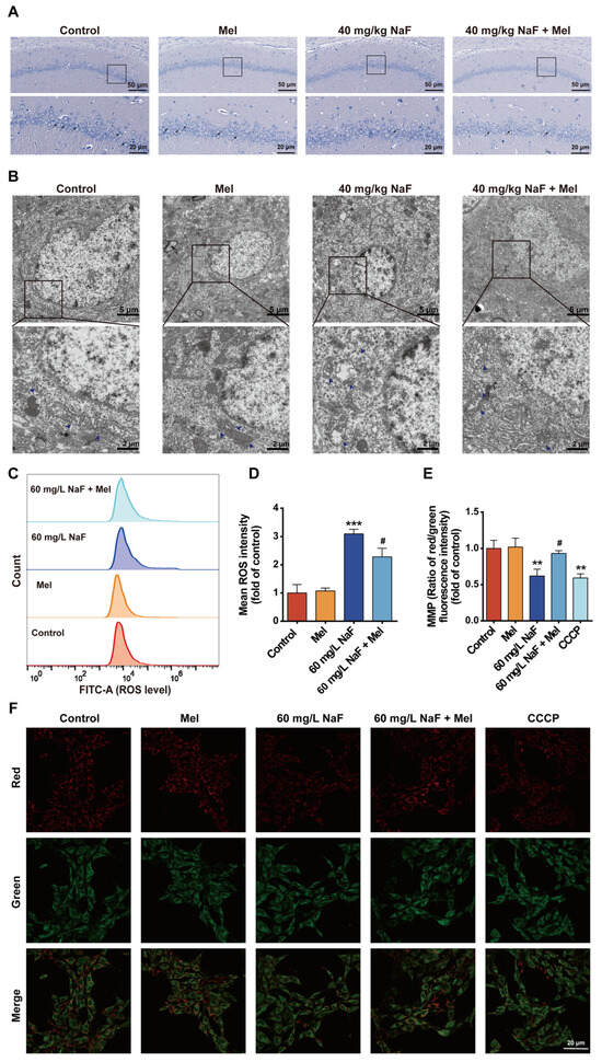 28]. Mel intervention significantly reversed cognitive behavioral abnormalities, indicating that Mel exerts a protective effect against NaF-induced cognitive damage. The structural integrity of neurons is fundamentally essential for maintaining brain function at the structural level, and Nissl bodies, as characteristic structures within the neuronal cytoplasm, can objectively reflect the extent of neuronal damage. Long-term ingestion of fluoride-contaminated drinking water (fluoride concentration exceeding 100 mg/L) damages the hippocampus and induces abnormal neuronal morphology [