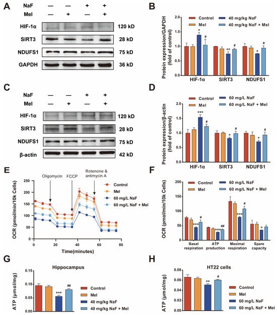 NaF (7681-49-4) and Mel (M5250) were obtained from Sigma (Ronkonkoma, NY, USA). Hypoxia-inducible factor 1 alpha (HIF-1α) (TA1009S) antibody was purchased from Abmart (Shanghai, China); NAD-dependent deacetylase sirtuin-3 (SIRT3) (10099-1-AP) and NADH dehydrogenase ubiquinone Fe-S protein 1 (NDUFS1) (12444-1-AP) antibodies were supplied by Proteintech (Rosemont, IL, USA). The Cell Counting Kit-8 (CCK-8, BS350B) was purchased from Biosharp (Beijing, China). The ATP assay kit (S0027) was purchased from Beyotime (Shanghai, China). The mitochondrial membrane potential assay kit (JC-1, M8650), RIPA lysis buffer (R0010), ROS assay kit (CA1410), and dimethyl sulfoxide (D8371) were provided by Solarbio (Beijing, China).
