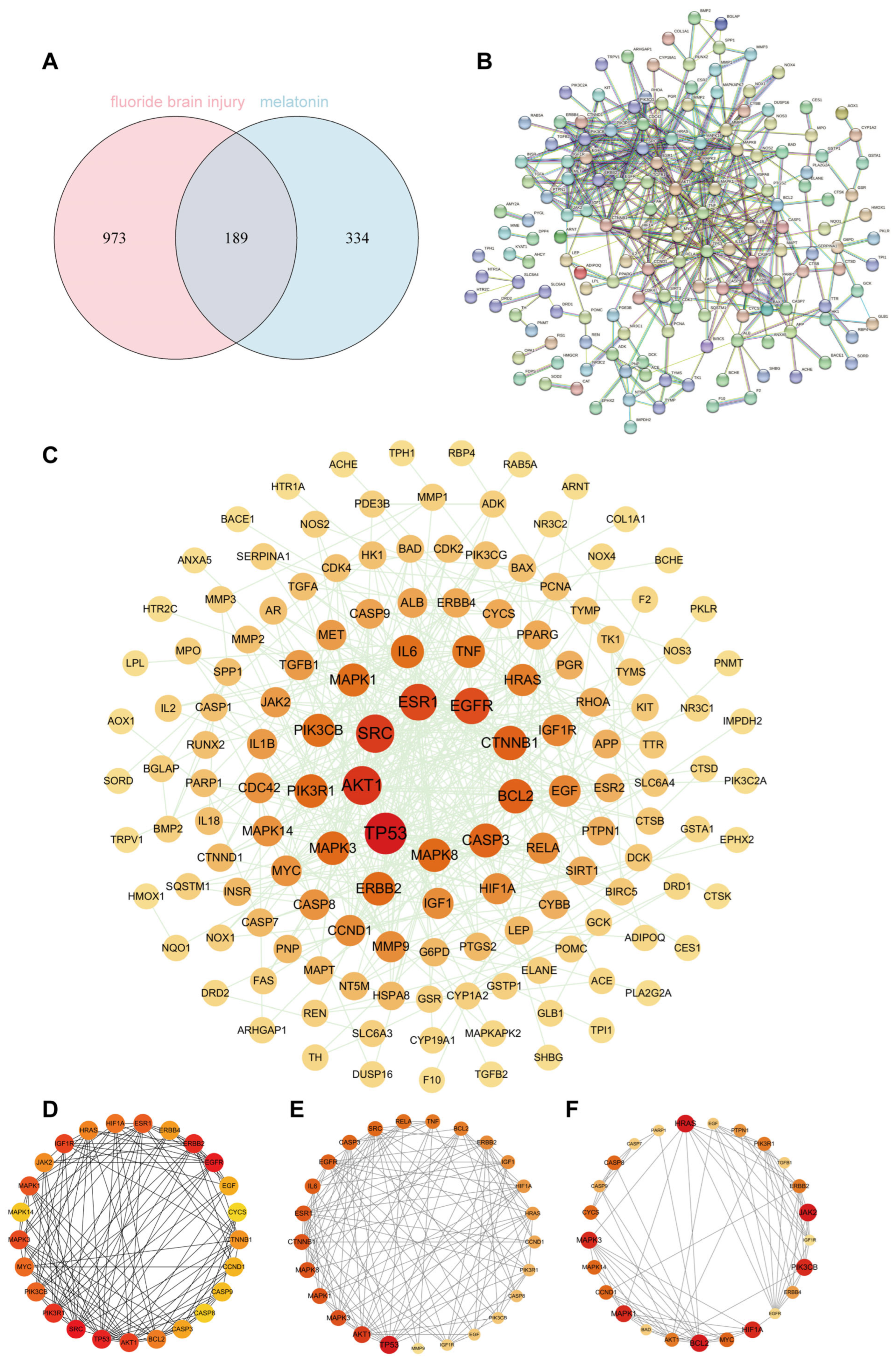 https://www.string-db.org) (accessed on 5 November 2025) with the species set to “Homo sapiens” and a confidence score threshold ≥ 0.9, to construct a PPI network of targets related to fluoride-induced brain injury and Mel. Key targets were identified from the network using various topological algorithms within the Cytoscape 3.10.1 software. Gene Ontology (GO) and Kyoto Encyclopedia of Genes and Genomes (KEGG) pathway enrichment analyses were conducted using the Metascape database (