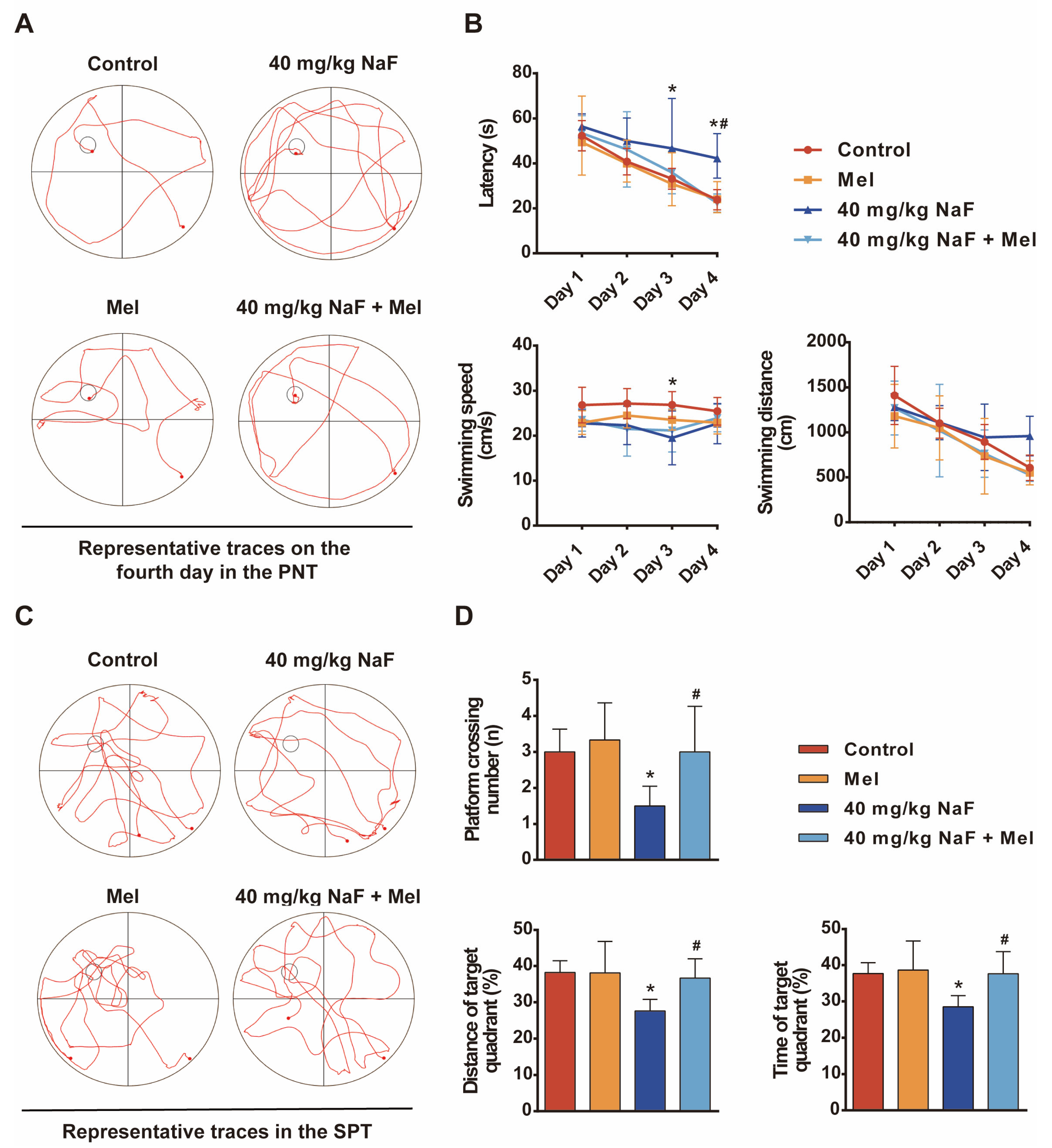 After one week of acclimatization, thirty-six SD rats were randomly assigned to 6 groups (female–male = 2:1) for cohabitation. NaF was given by gavage, and Mel by intraperitoneal injection. The experimental groups were as follows: control group (administered double-distilled water), NaF group (40 mg/kg/day), Mel group (10 mg/kg/day), and combined NaF and Mel group (40 mg/kg/day NaF and 10 mg/kg/day Mel). Pregnant females were singly housed and continued their respective treatments. Offspring received intraperitoneal Mel (10 mg/kg/day) [