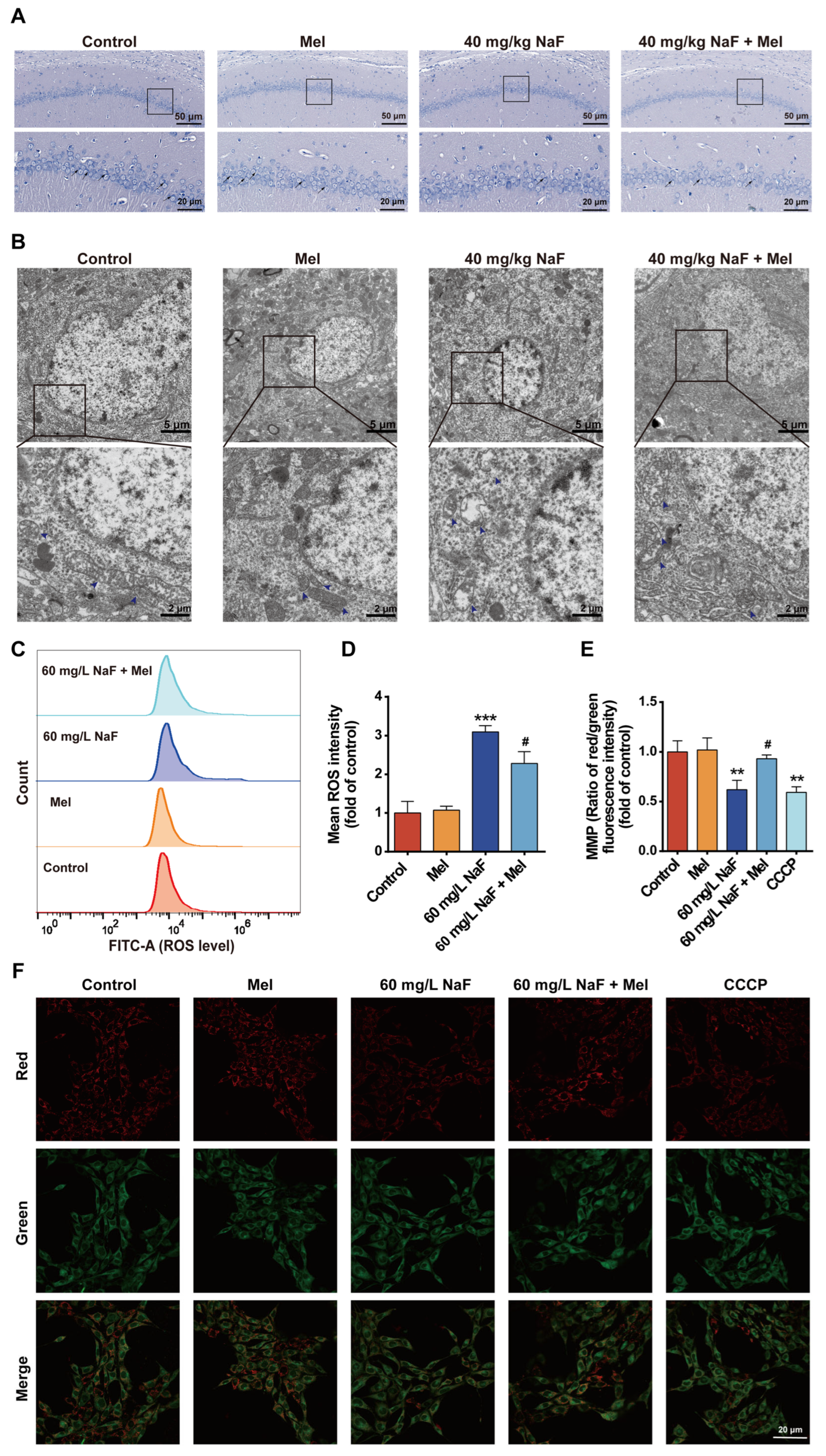 33] reported that NaF exposure impairs the structure and function of hippocampal neuronal mitochondria, which is characterized by excessive ROS accumulation and diminished MMP. This study found that NaF exposure induced mitochondrial cristae fragmentation and matrix vacuolization in hippocampal neurons, disrupting the integrity of mitochondrial structures, whereas Mel intervention significantly restored mitochondrial cristae structure and reduced the degree of vacuolization. The accumulation of ROS can further exacerbate mitochondrial dysfunction, forming a vicious cycle of ROS accumulation and mitochondrial damage [