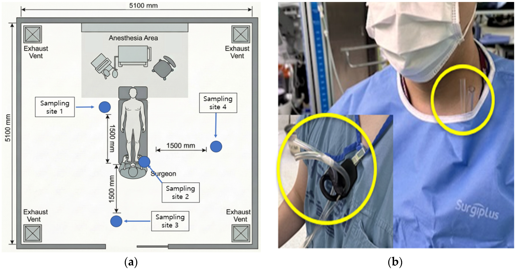 - Kawaguchi, Y.; Yoshizaki, Y.; Kawakami, T.; Iwamoto, M.; Hayakawa, T.; Hayashi, Y.; Sawa, Y.; Ito, K.; Kashiwabara, K.; Akamatsu, N.; et al. Effect of Smoke Evacuator on Reduction of Volatile Organic Compounds and Particles in Surgical Smoke: A Randomized Controlled Trial. J. Am. Coll. Surg. 2024, 238, 272–279. [Google Scholar] [CrossRef]