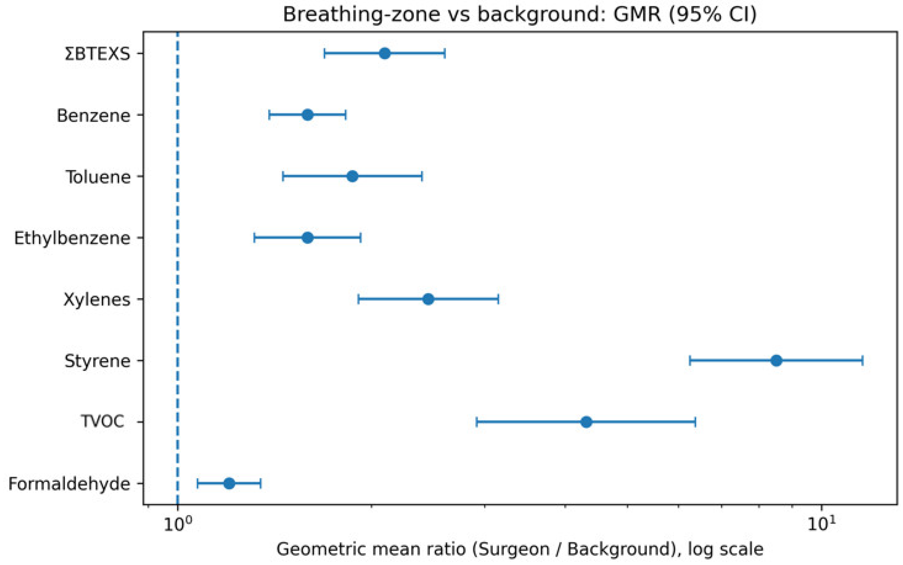 | Analyte | Surgeon GM (GSD), µg/m3 | Background GM (GSD), µg/m3 | GMR (95% CI) | p (Paired t-Test on ln Ratios) |