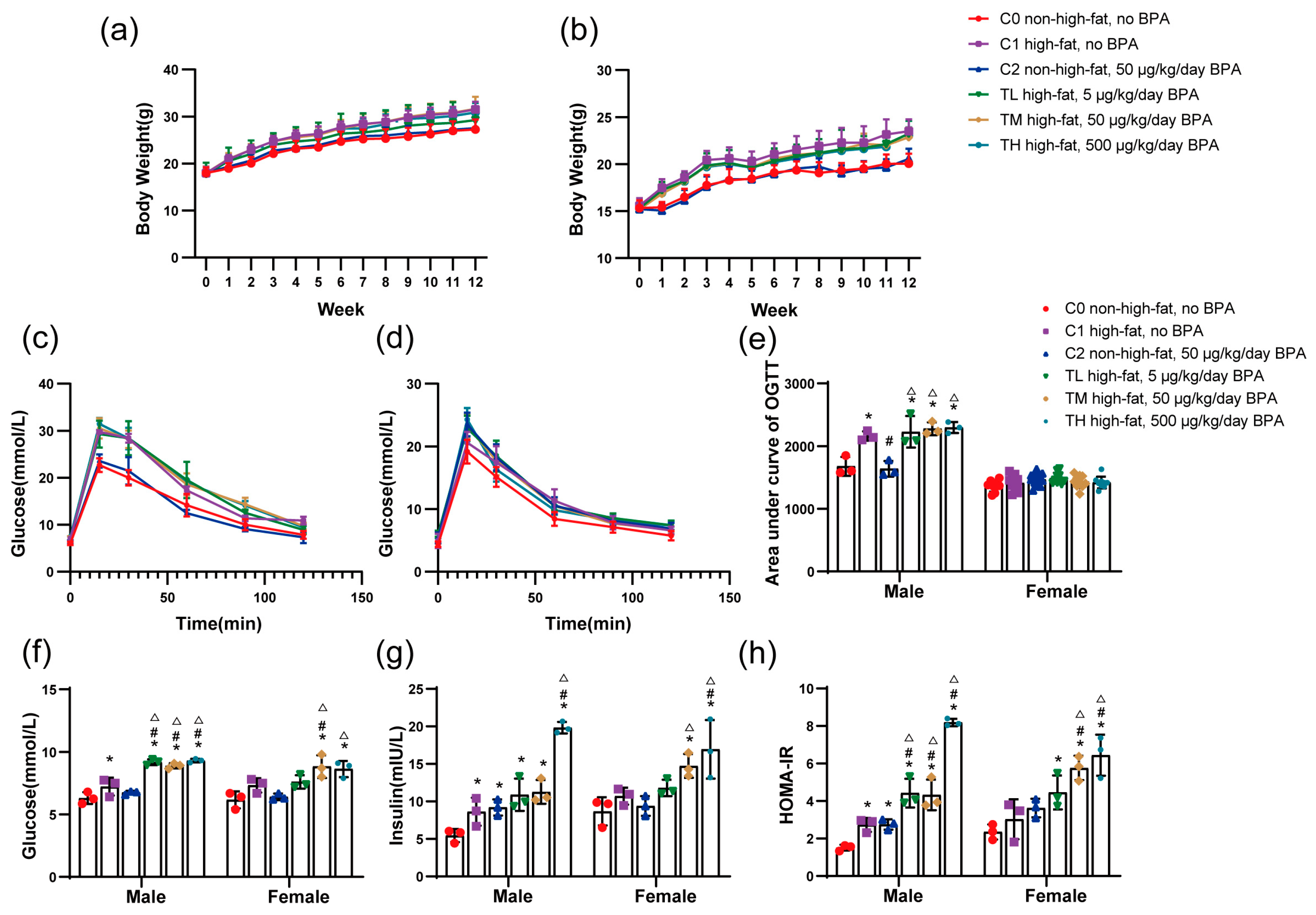 3.1. BPA in Combination with an HFD Exacerbates IR
