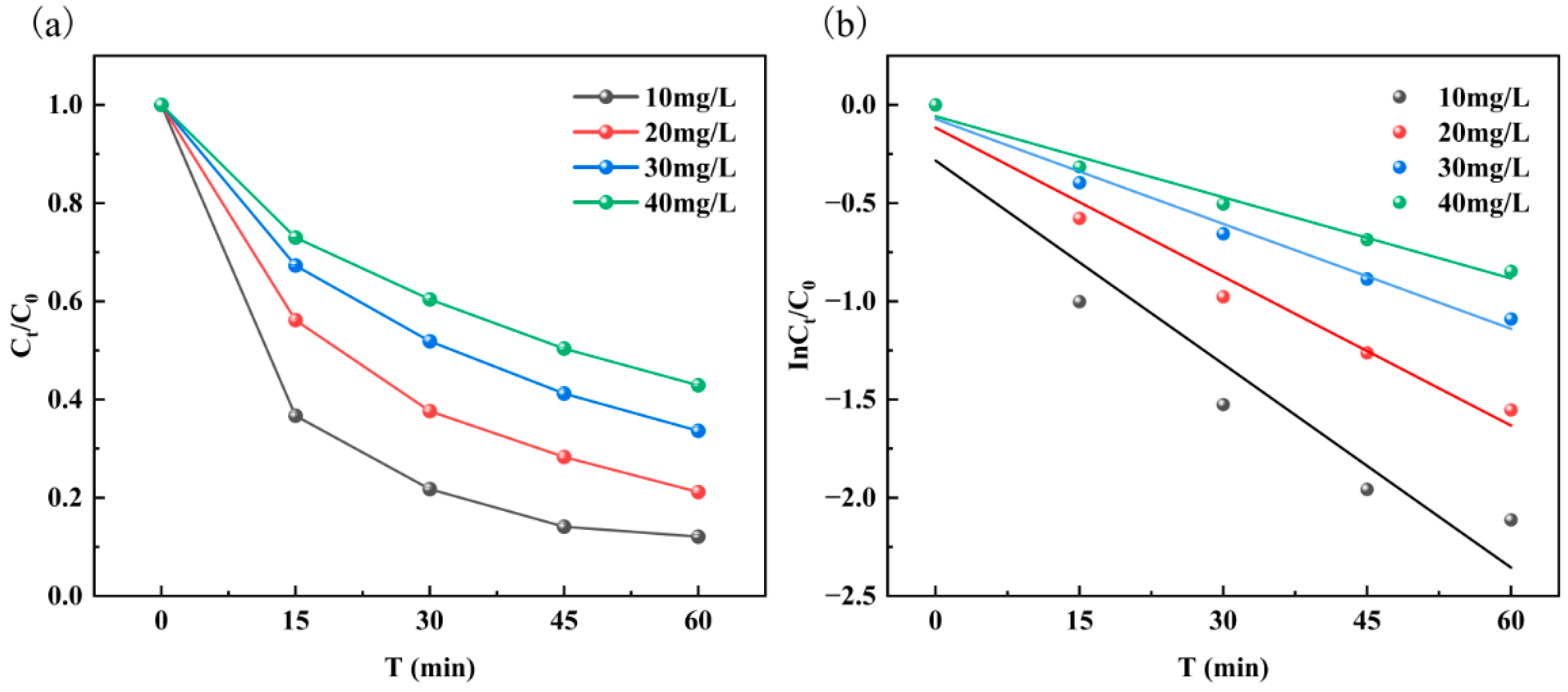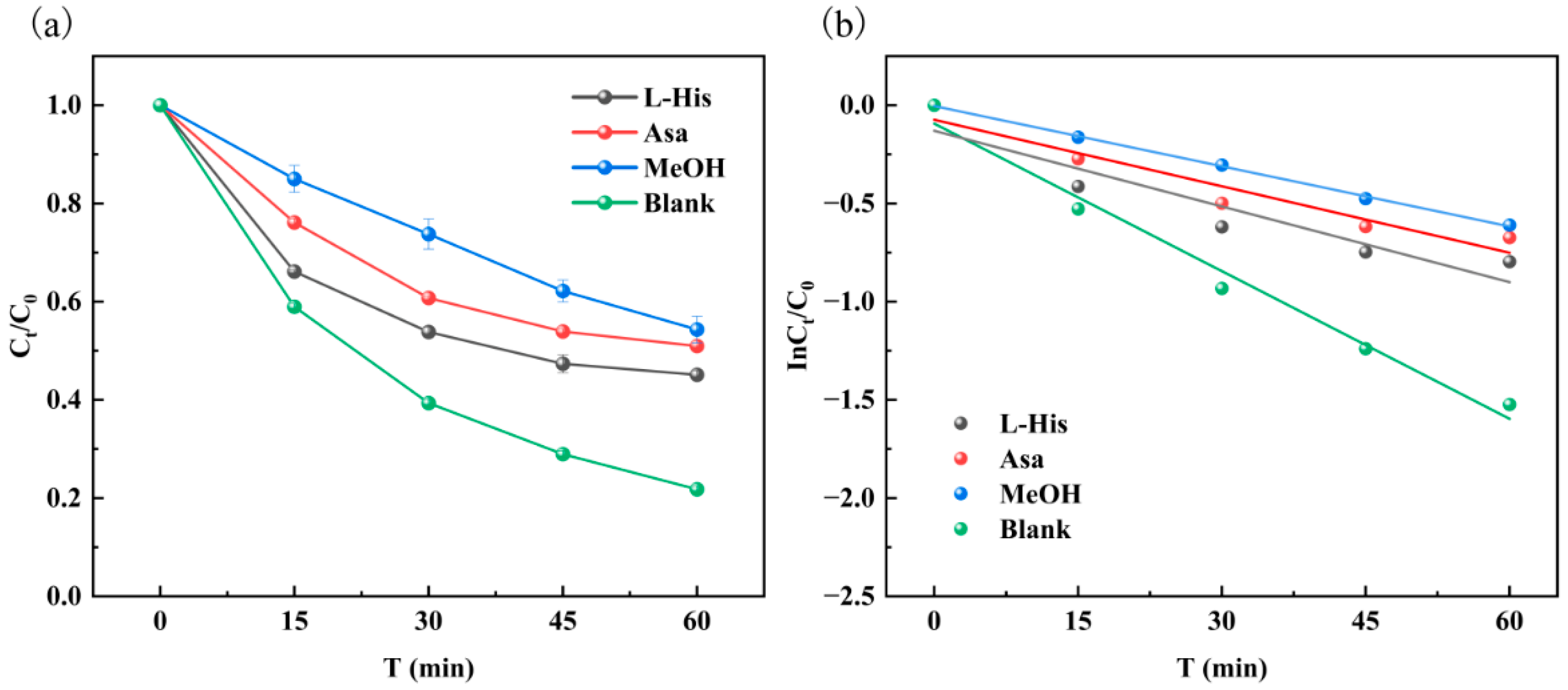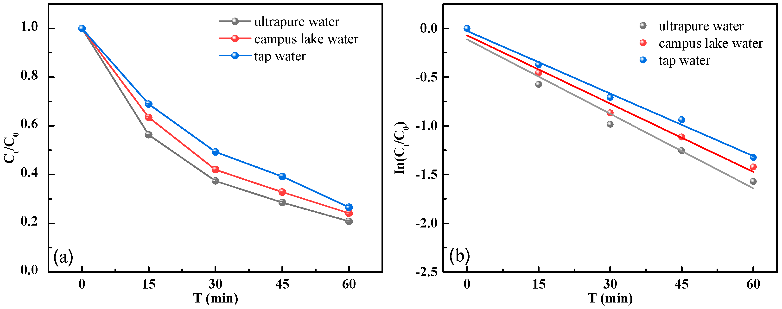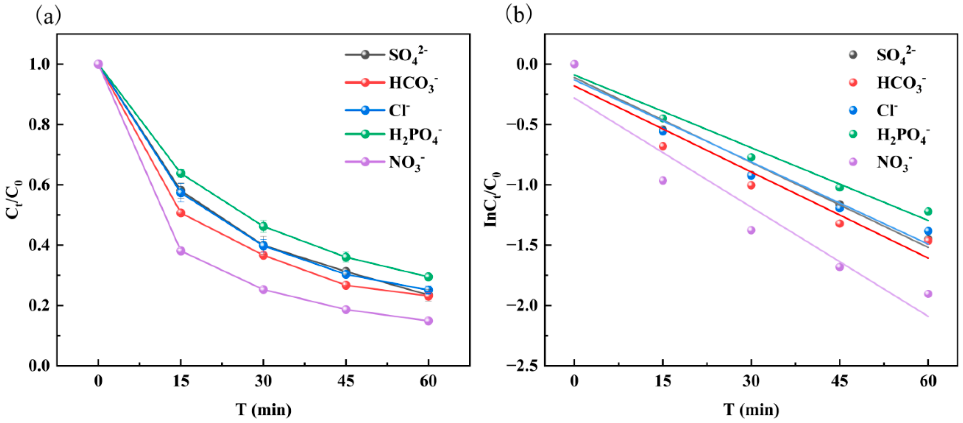 - NO3− promotes TC degradation in the system, as it can be photoactivated under UV irradiation to produce reactive radicals such as ·OH, thereby enhancing degradation efficiency. Other anions inhibit the reaction system, with the order of inhibitory effect being: H2PO4− > Cl− > HCO3− > SO42−.