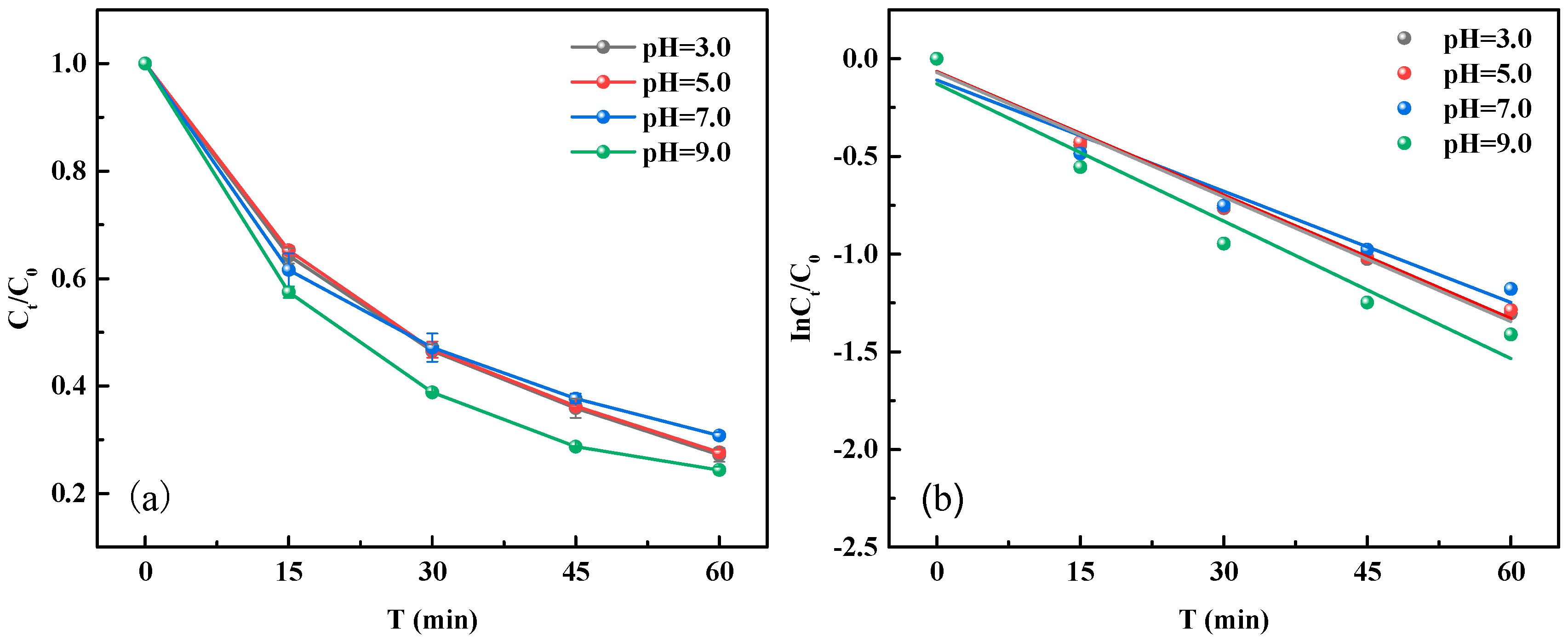 - The solution pH influences the stability of PAA and consequently affects degradation performance. Under neutral pH conditions, PAA decomposition leads to relatively lower radical generation efficiency, resulting in slower degradation rates.
