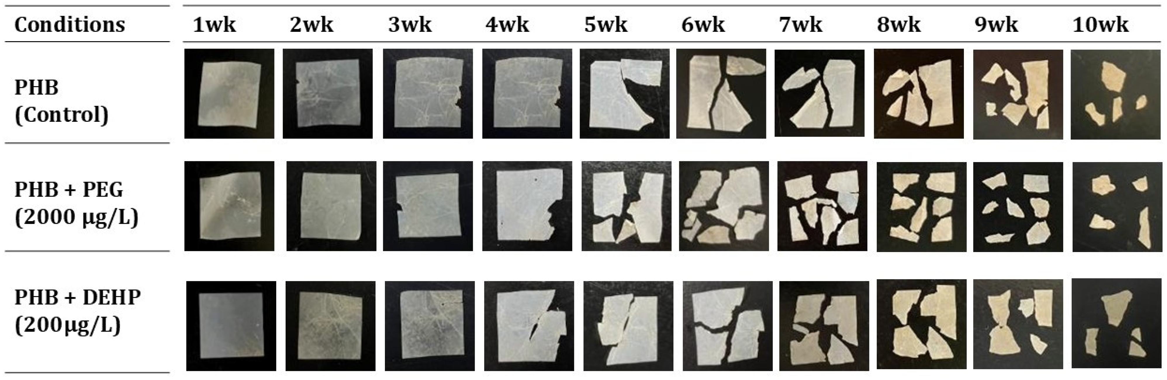 - Altaee, N.; El-Hiti, G.A.; Fahdil, A.; Sudesh, K.; Yousif, E. Biodegradation of Different Formulations of Polyhydroxybutyrate Films in Soil. SpringerPlus 2016, 5, 762. [Google Scholar] [CrossRef] [PubMed]