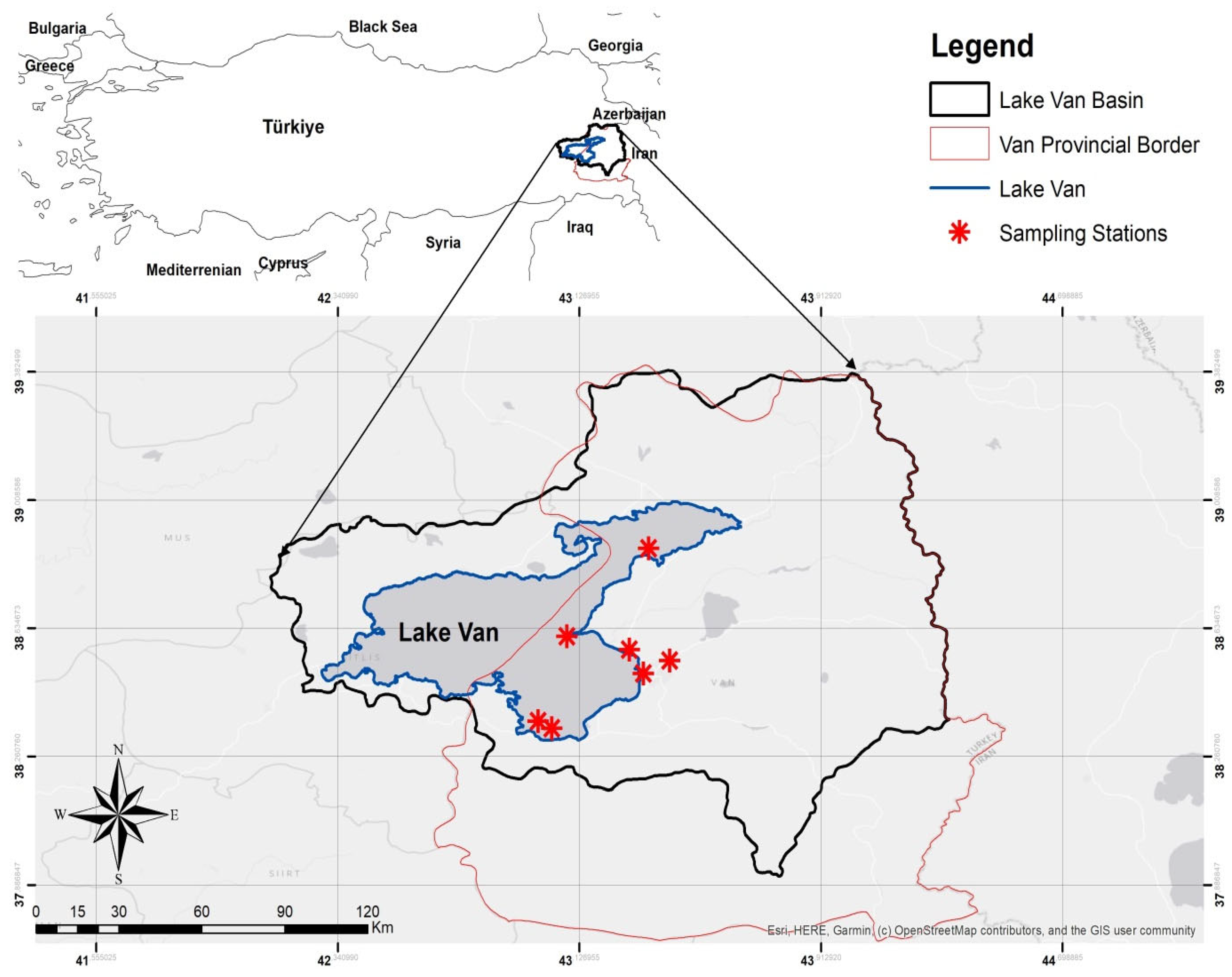 - Kaba, M.O.; Minaz, M.; Kaya, C.; Jouy, T.; Kurtul, I.; Aytan, Ü. Silent invaders of freshwater ecosystems: Unveiling the microplastic crisis threatening the world’s largest soda lake (Lake Van, Türkiye). J. Great Lakes Res. 2025, 51, 102604. [Google Scholar] [CrossRef]