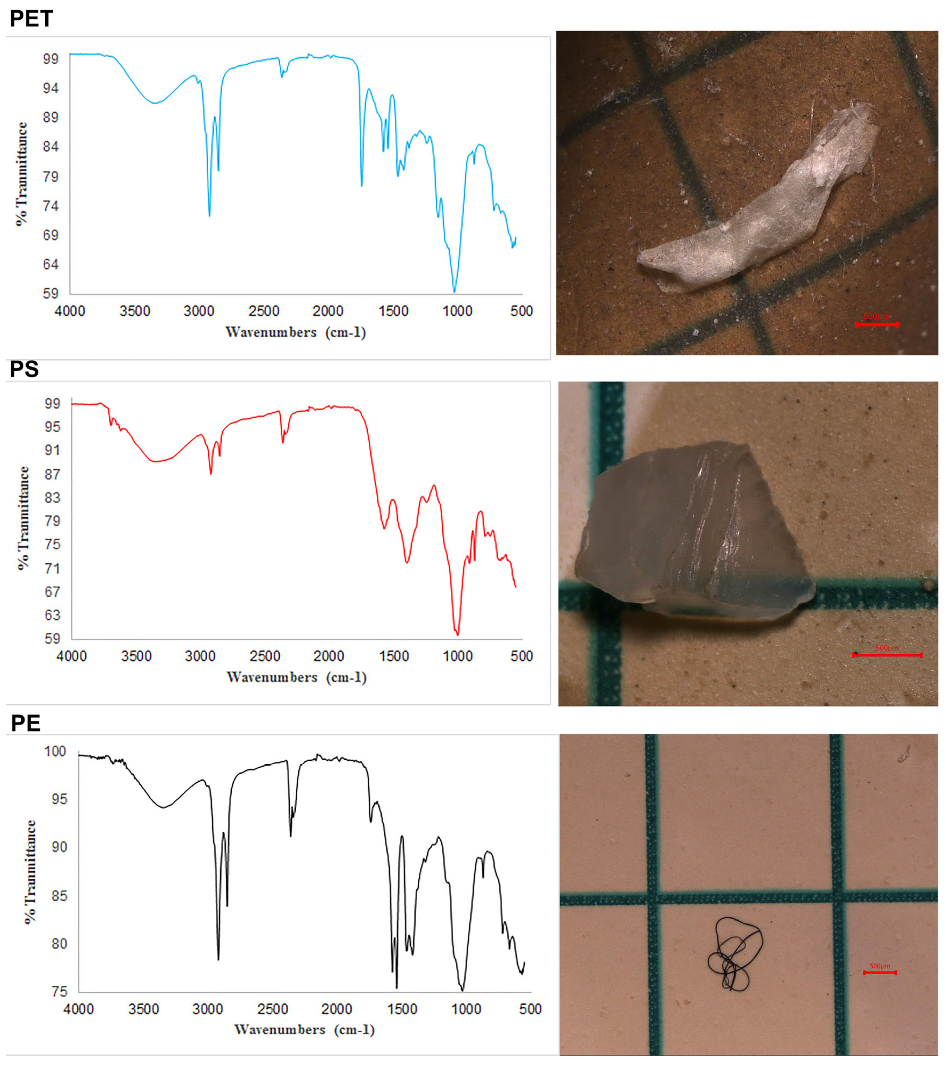 - Teboul, E.; Orihel, D.M.; Provencher, J.F.; Drever, M.C.; Wilson, L.; Harrison, A.L. Chemical identification of microplastics ingested by Red Phalaropes (Phalaropus fulicarius) using Fourier Transform Infrared spectroscopy. Mar. Pollut. Bull. 2021, 171, 112640. [Google Scholar] [CrossRef]