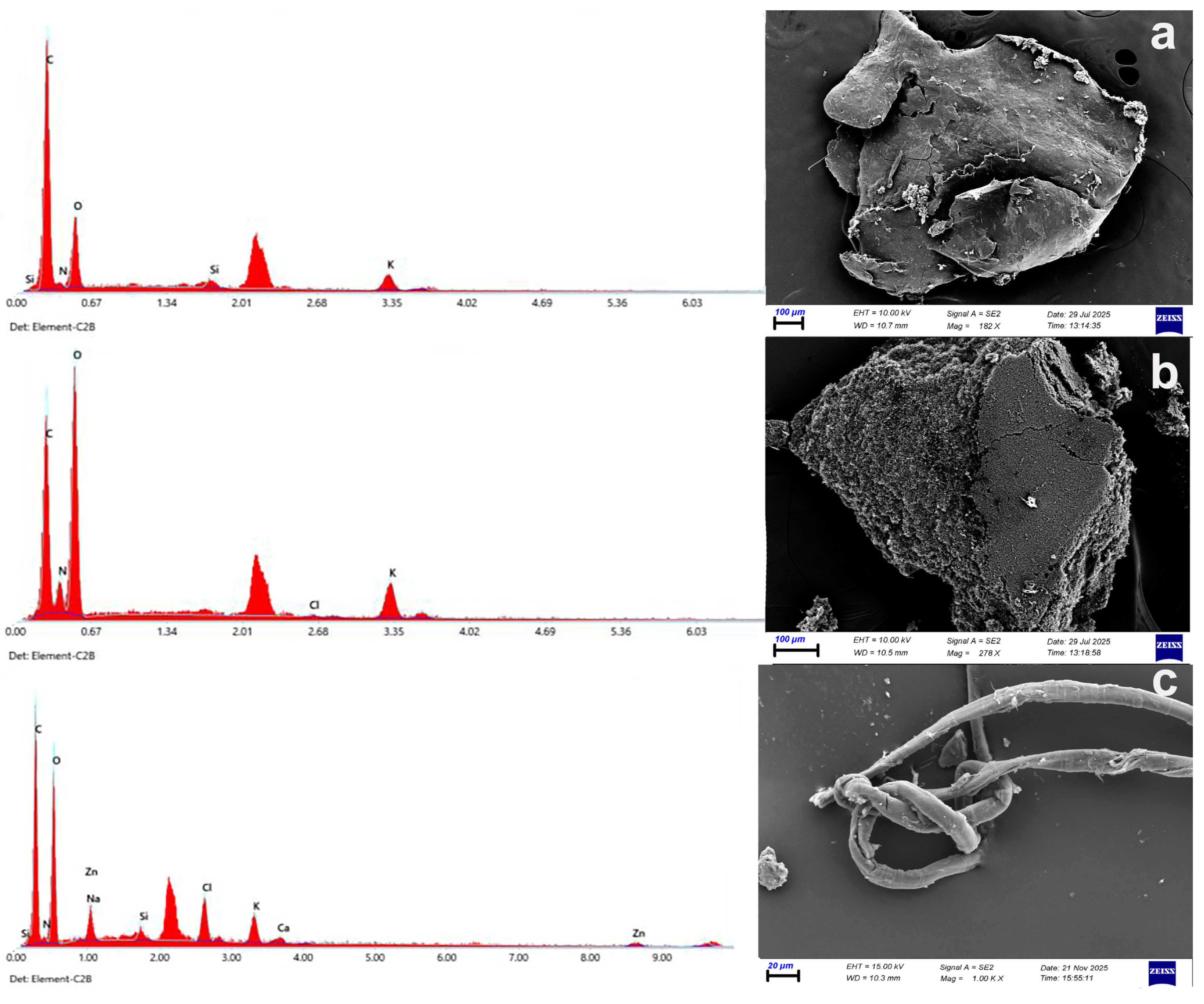 2.4. SEM–EDX Sample Processing and Analysis