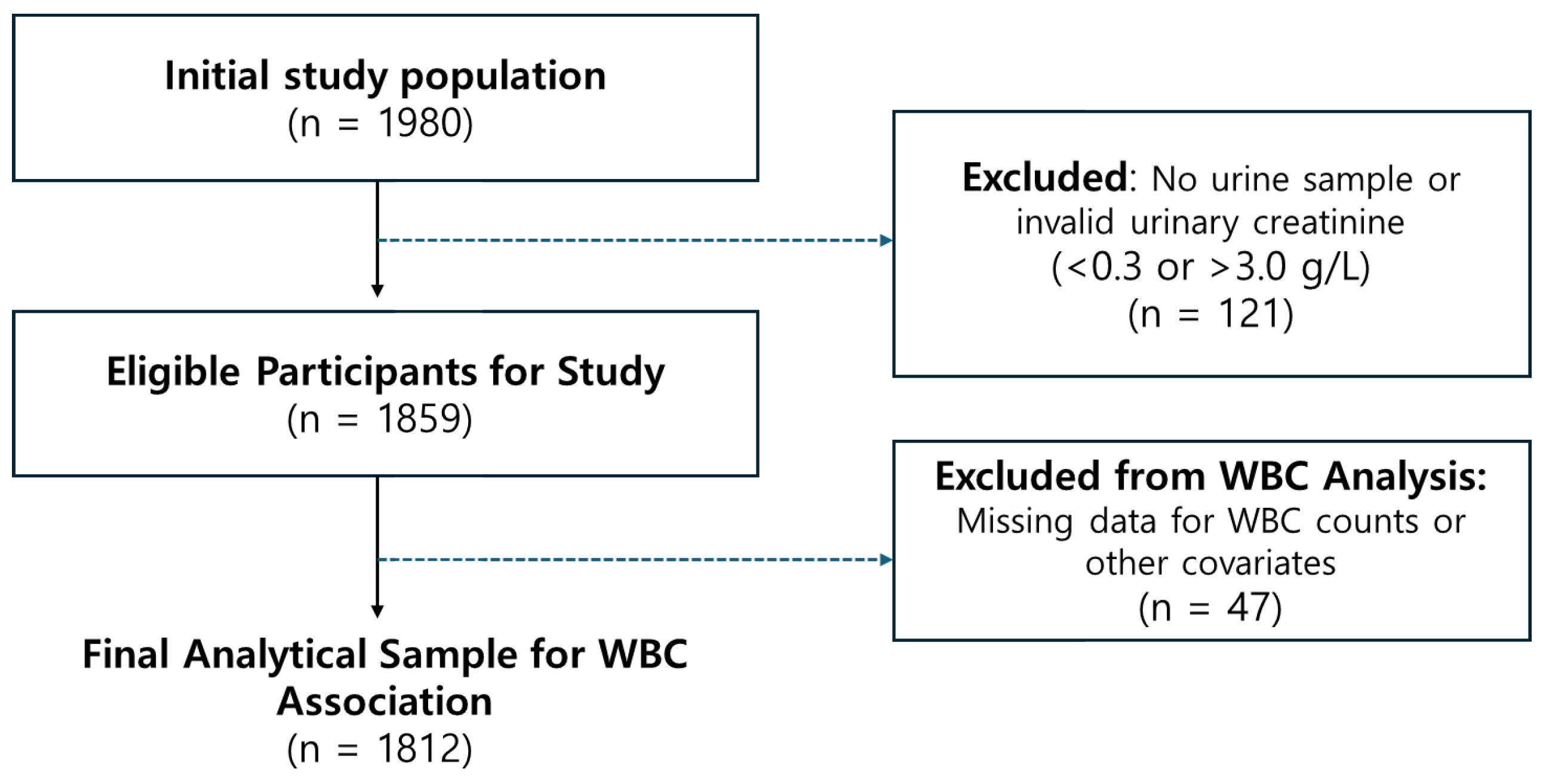 Table 1) and environmental validation analysis. For WBC regression analyses, 47 participants with missing WBC or covariate data were further excluded, resulting in a final analytic sample of 1812 adults. Complete case analysis was used, as the proportion of missing data was small (<3%) and appeared to be missing at random with respect to key variables. The participant selection process is shown in