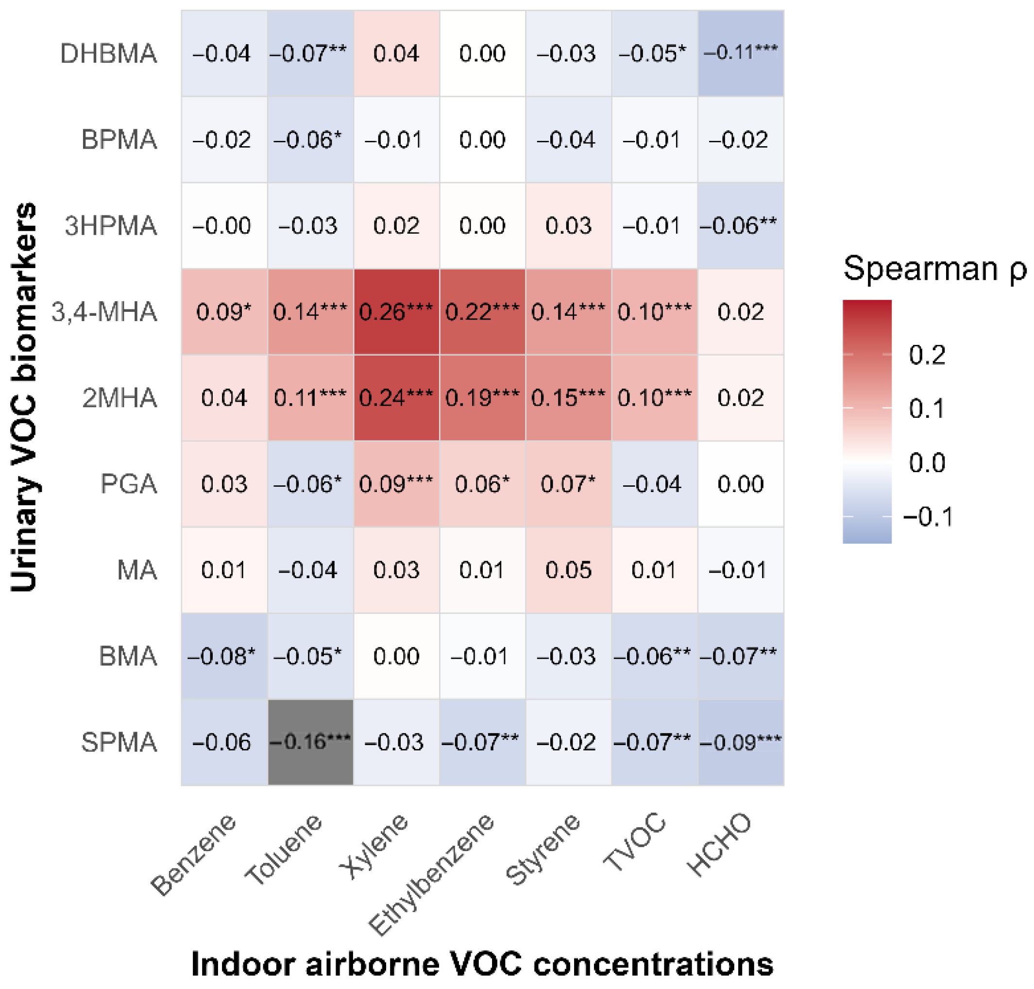 Figure 2 presents a Spearman correlation heatmap between indoor air VOC concentrations and urinary VOC biomarkers. Correlations were generally weak to moderate but showed distinct clustering patterns. Xylene metabolites (2MHA and 3,4MHA) showed stronger correlations with indoor xylene, supporting their specificity as biomarkers of solvent-dominant exposure, whereas other metabolites (BPMA, DHBMA, 3HPMA) demonstrated broader correlation patterns across multiple VOCs, suggesting mixed or shared exposure sources. These structured correlation patterns are consistent with the source-oriented factor structure identified in