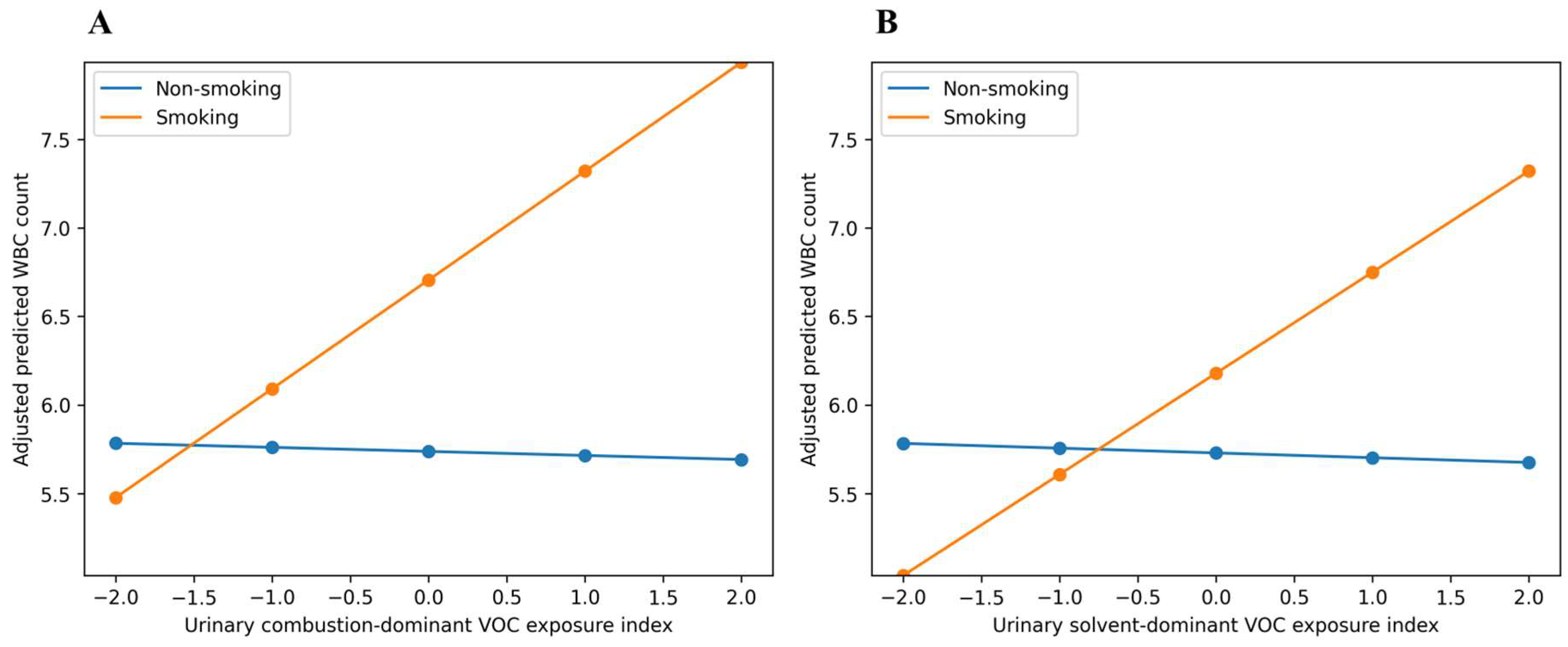These patterns visually demonstrate that the association between urinary VOC exposure indices and WBC count was predicted to be stronger among smokers than non-smokers, consistent with the significant effect modification by smoking reported in