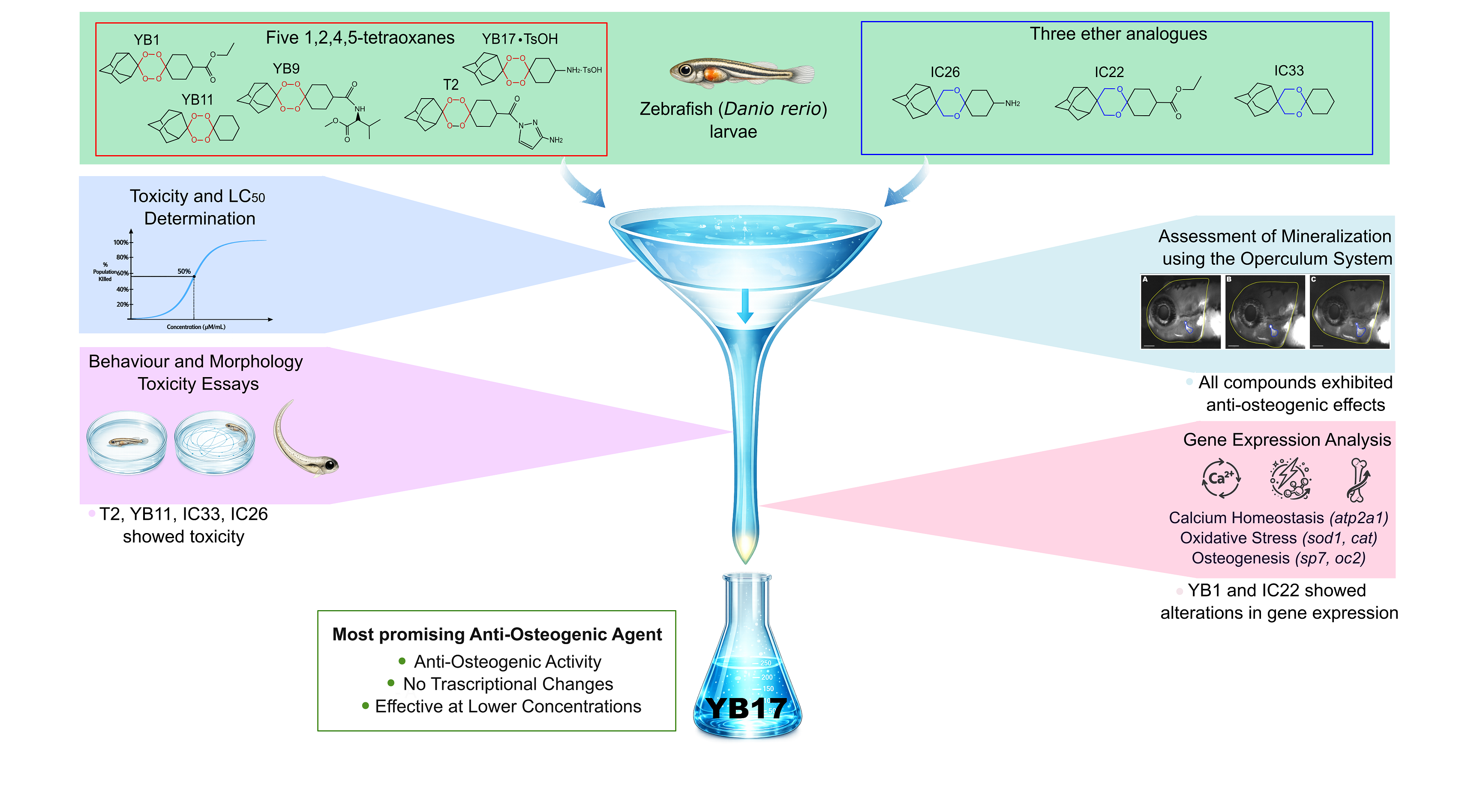 To the best of our knowledge, this study is the first to evaluate the potential of artemisinin-inspired endoperoxides as anti-osteogenic molecules. We aimed to investigate the effects of novel synthetic endoperoxides on calcium homeostasis, using zebrafish larvae as a vertebrate model, by examining whether these compounds alter Ca2+-ATPase activity or target other molecular pathways involved in ossification, as well as assessing their potential toxicity and biological activity—particularly their effects on osteogenic processes—in non-parasitic organisms. To evaluate the relevance of the peroxide function on activity, selected ether analogues lacking the peroxide bond were also prepared, and their properties were investigated under similar conditions.