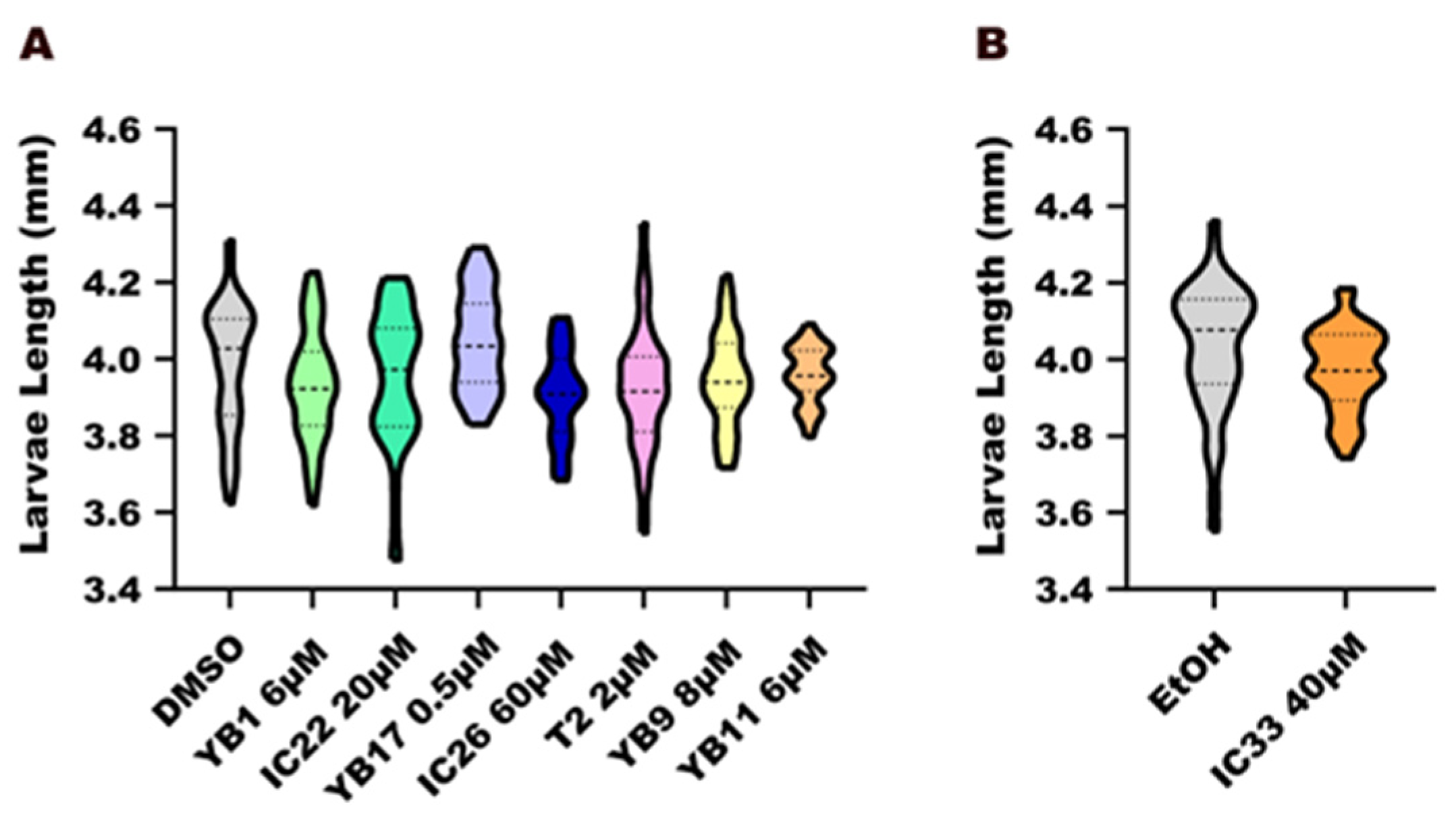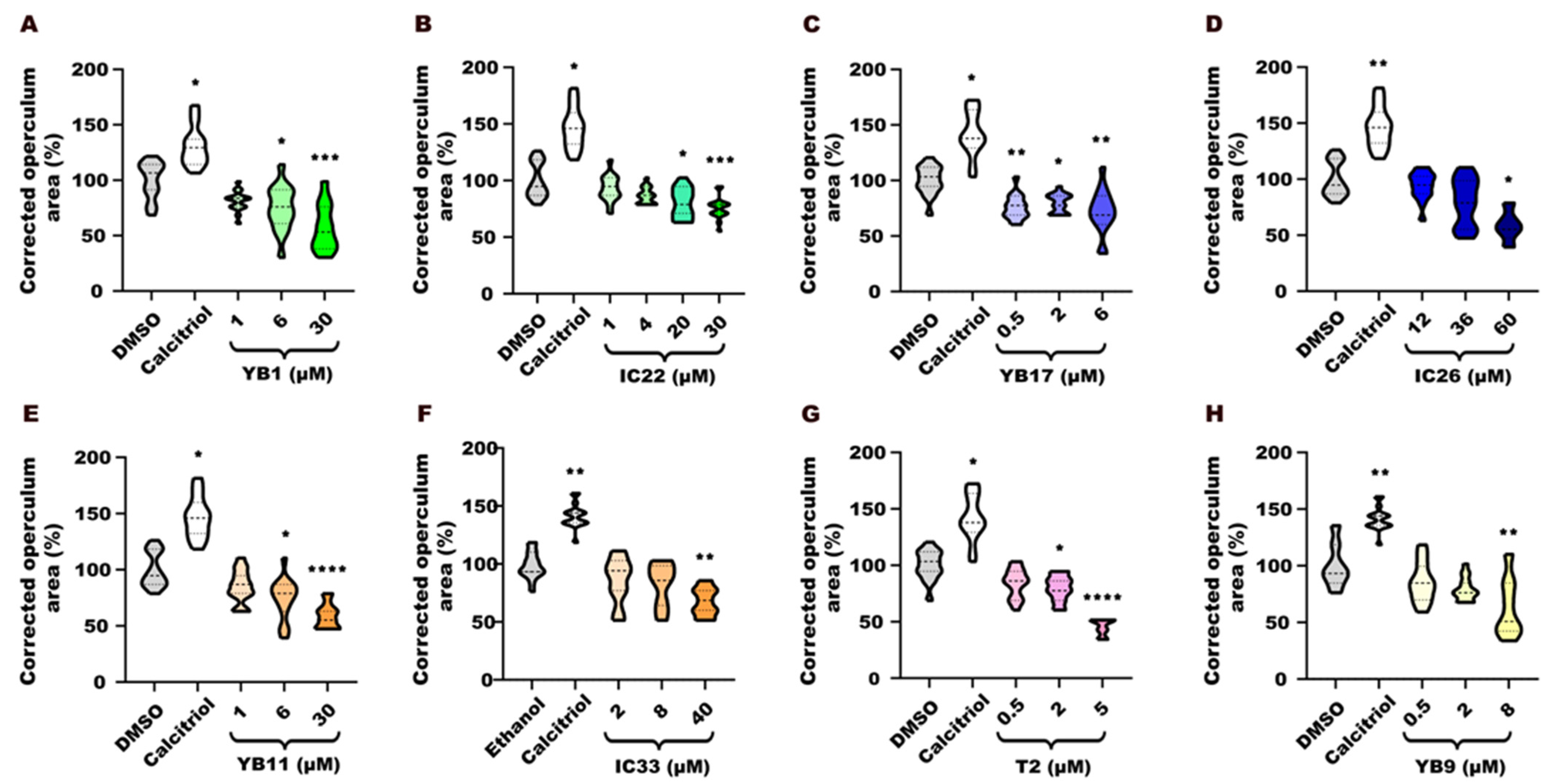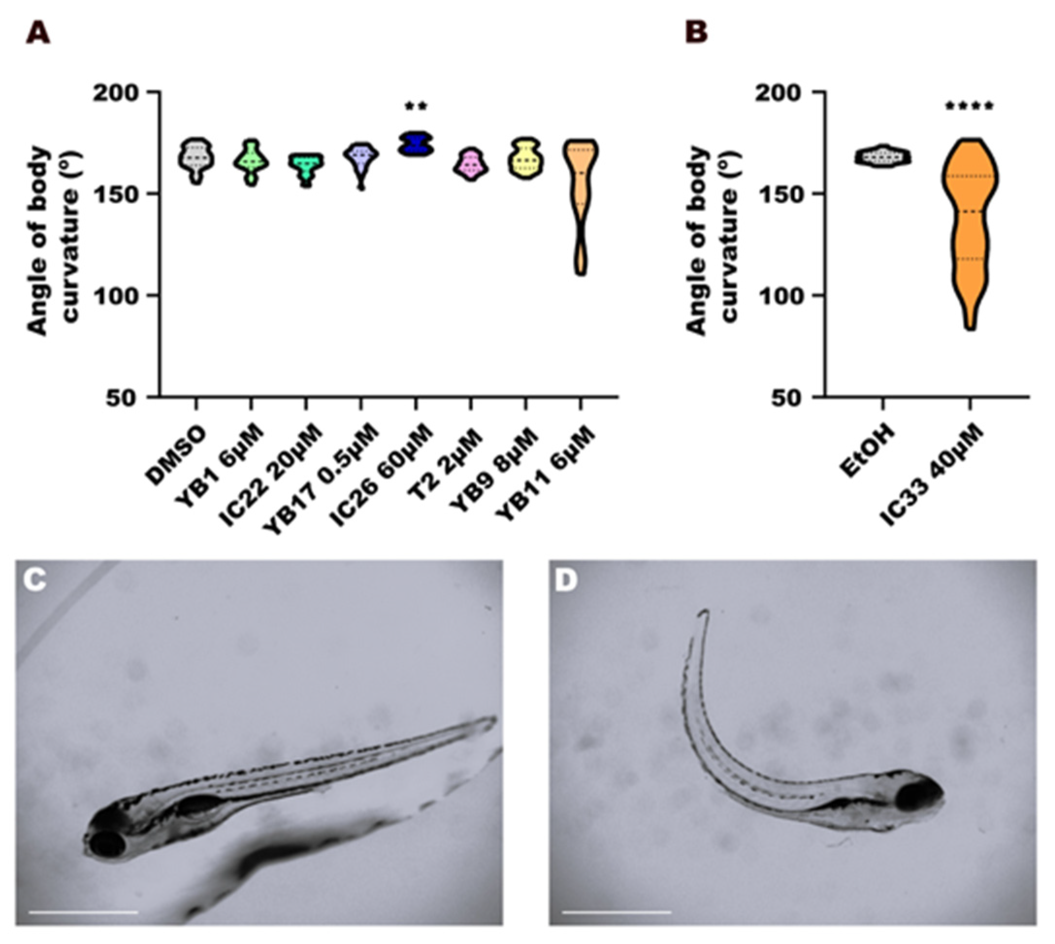Larvae of WT-AB zebrafish at 3 dpf were transferred to 12 well-plates at a density of 5 larvae in 5 mL of water. The larvae were exposed to a range of concentrations of each compound: YB1 (1, 6, 30 µM), YB9 (0.5, 2, 8 µM), YB11 (1, 6, 30 µM), YB17 (0.5, 2, 6 µM), IC22 (1, 4, 20, 30 µM), IC26 (12, 36, 60 µM), IC33 (2, 8, 40 µM), T2 (0.5, 2, 5 µM). Ethanol (Merck, Darmstadt, Germany) (0.1%) and dimethyl sulfoxide (DMSO; Sigma-Aldrich, St. Louis, MO, USA) (0.1%) were used as negative controls (solvents), and calcitriol at 10 pg/mL (Sigma-Aldrich, St. Louis, MO, USA) was used as a positive control. The treatment medium was renewed (70% of the total volume) daily until the end of the treatment period.