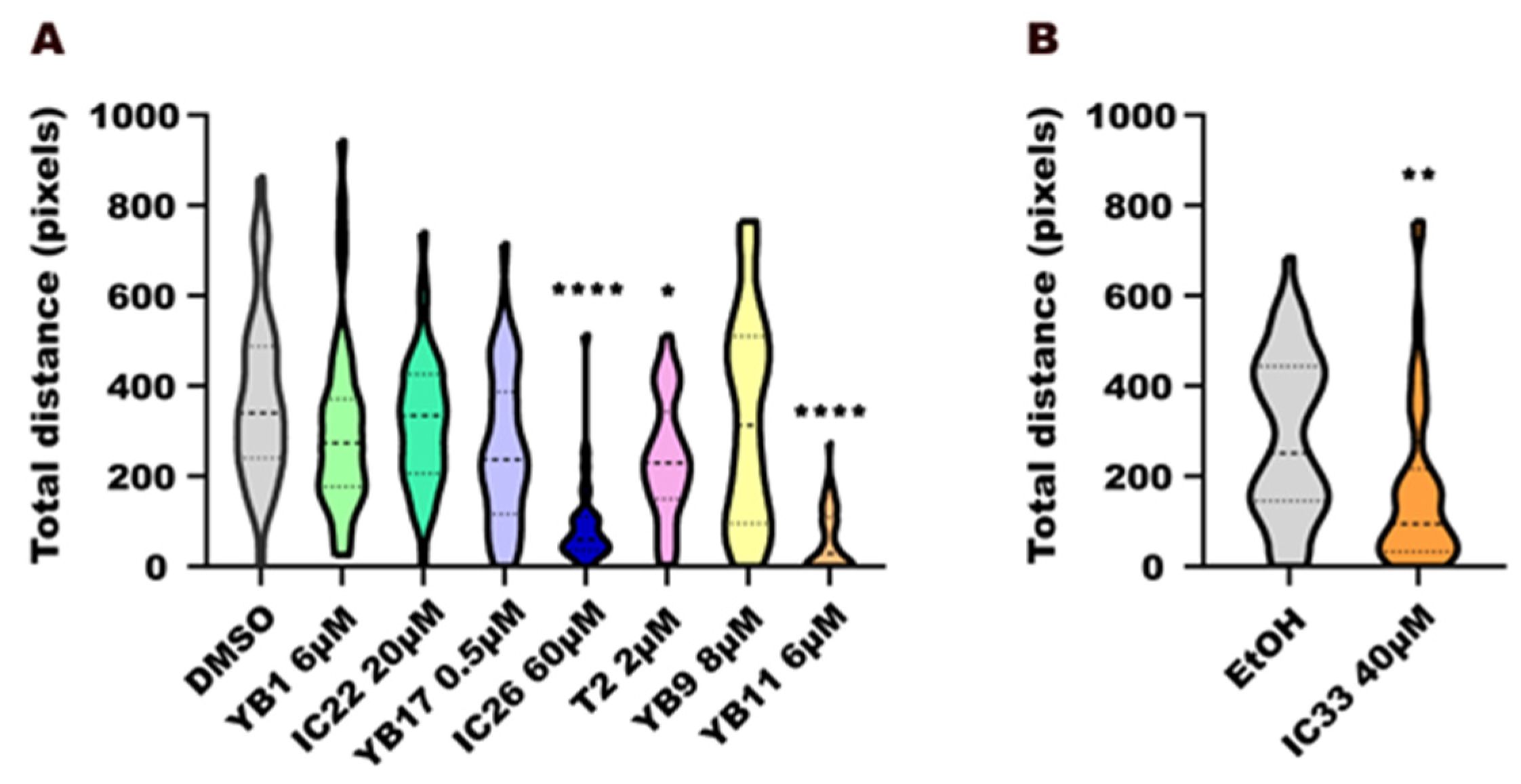 Zebrafish larvae at 6 dpf were used to determine alterations of behaviour after experimental exposure to the compounds. Eight treatment groups (YB1, YB9, YB11, YB17, T2, IC22, IC26 and IC33) and two negative control groups (DMSO and Ethanol) were tested at the lowest concentration of each compound that exhibited osteogenic activity. Each group was run in triplicate with 15 larvae per replicate. Single larvae were added to each well of a standard 24-well plate, containing 2 mL of system water. The plate was allowed a 10 min acclimation period to reduce handling stress and hyperactivity. After acclimation, the plate was loaded into the Zantiks MWP automated testing unit (Zantiks Ltd., Cambridge, UK), where locomotor behaviour was tracked for 5 min under constant illumination (i.e., 100 lux white light) following the methodology described in Varela et al. (2022) [