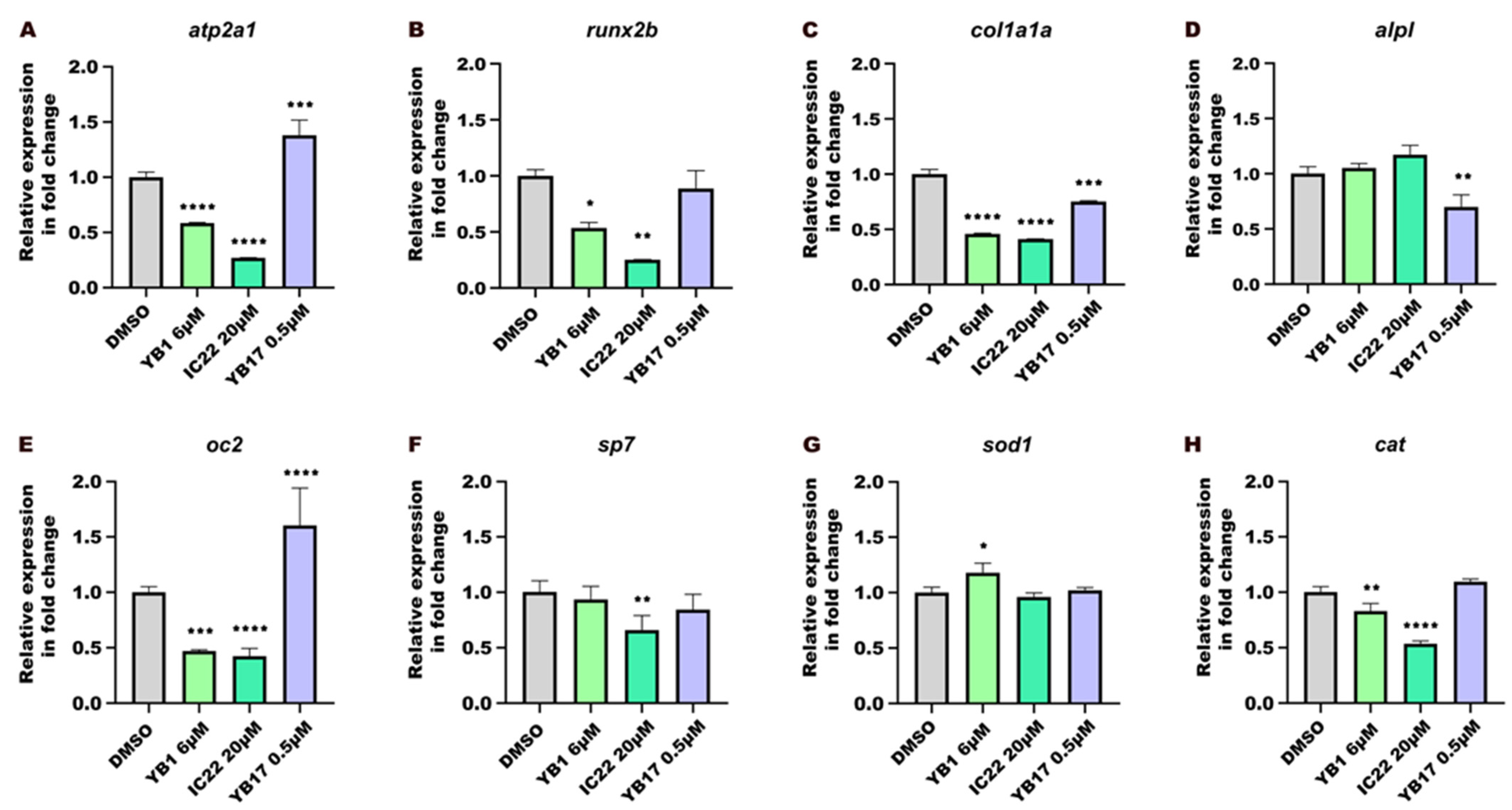 For gene expression analysis by qPCR, cDNA from larvae exposed to three test compounds—IC22, YB1, and YB17—at the lowest concentration of each compound that exhibited osteogenic activity, and a negative control (DMSO) was used. The expression levels of marker genes for oxidative stress response (i.e., catalase, cat; superoxide dismutase 1, sod1) and for bone and skeletal muscle development (i.e., osterix, sp7; osteocalcin 2, oc2; sarco/endoplasmic reticulum Ca2+-ATPase 1, atp2a1; alkaline phosphatase, biomineralization associated, alpl; collagen, type I alpha 1a, col1a1a; and runt-related transcription factor 2b, runx2b) were quantified. All qPCR assays were repeated three times using biological replicates (n = 3).
