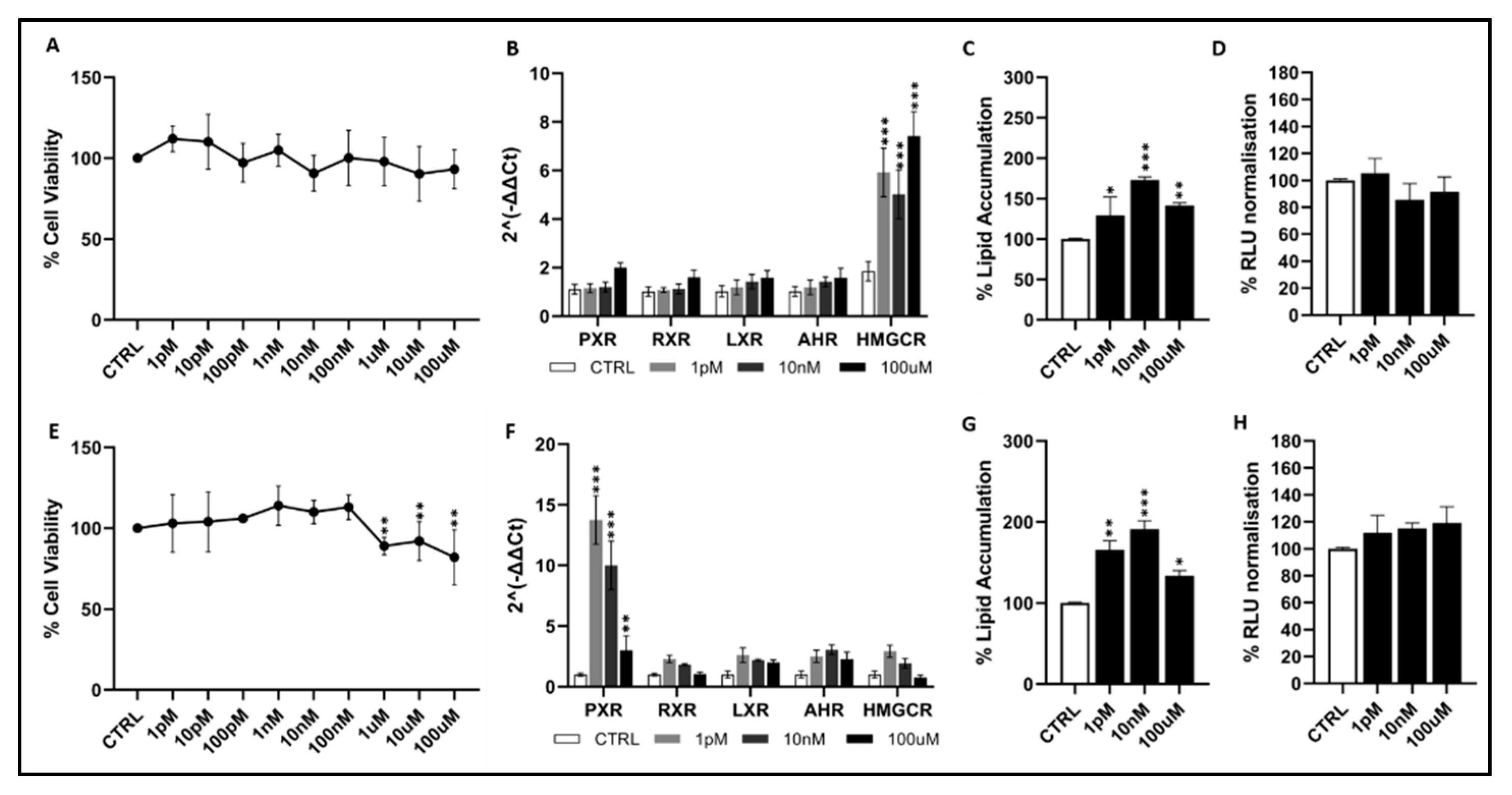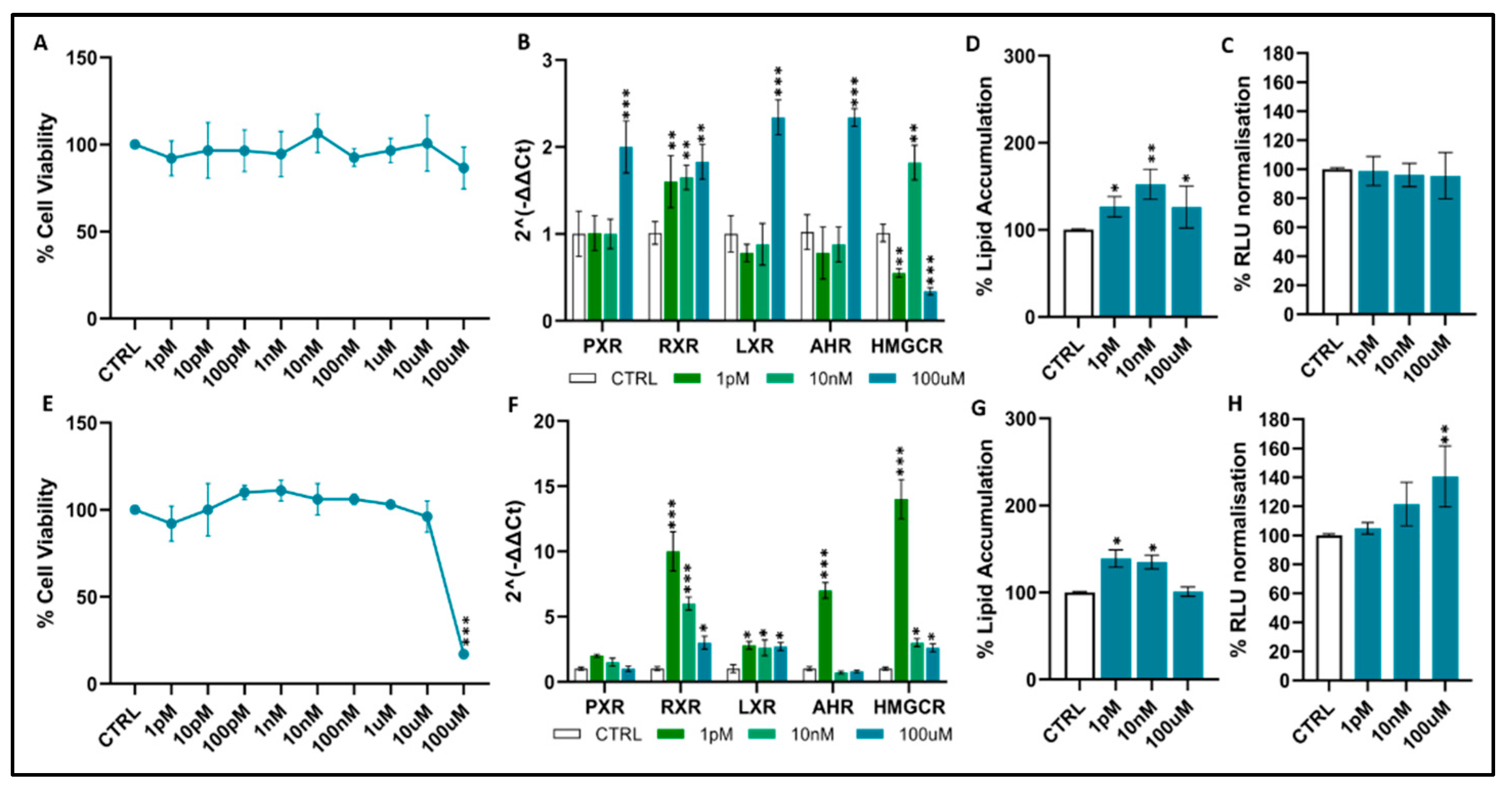 Figure 2B), PXR, RXR, LXR and AHR were significantly upregulated, particularly at 10 nM and 100 µM, reaching approximately 2–3-fold increases relative to the control (