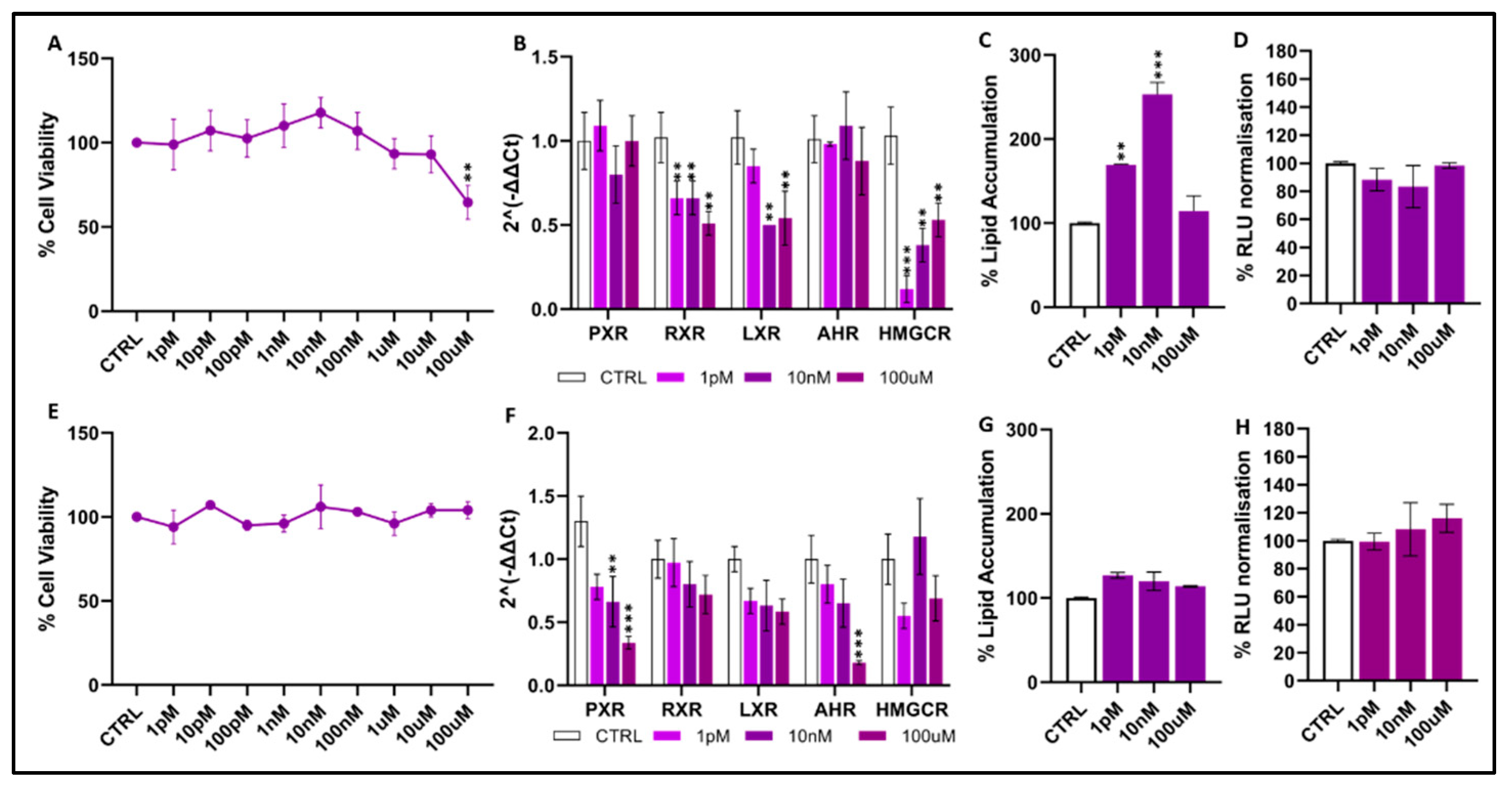Figure 4B) exhibited relatively modest gene-expression changes, evidenced by slight downregulation of PXR, RXR and LXR at 10 nM and 100 µM, though without a clear dose-dependent pattern. AHR displayed a minor but significant decrease at 100 µM (