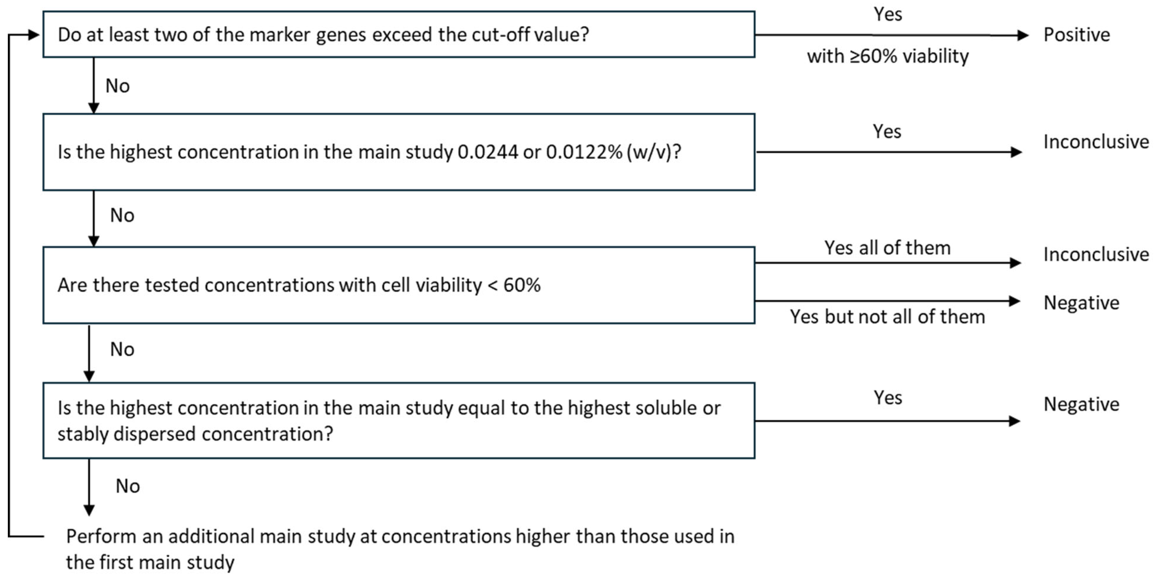 | Prediction Model (Positive Result) | Prediction is positive if at least one marker gene exceeds its cut-off (Imax) at an accepted concentration. | Prediction is positive if at least two marker genes exceed their respective cut-off values (Imax) at an accepted concentration. | Modified criterion. The requirement was increased to two positive genes to enhance robustness, a modification common when using different tissue models in similar method validation. |