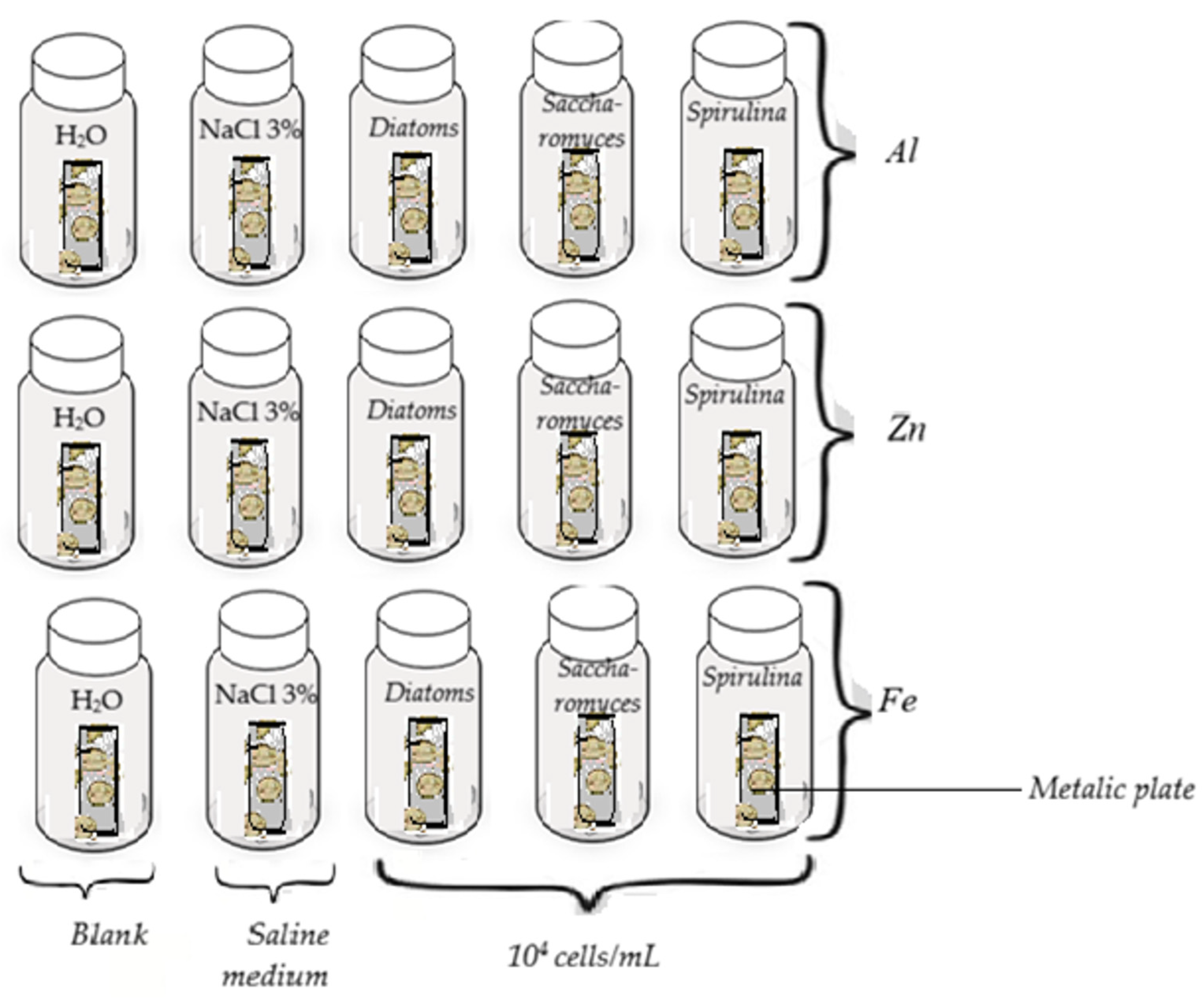 | H2O | NaCl 3% | Diatoms | Saccharomyces c. | Spirulina p. | ||