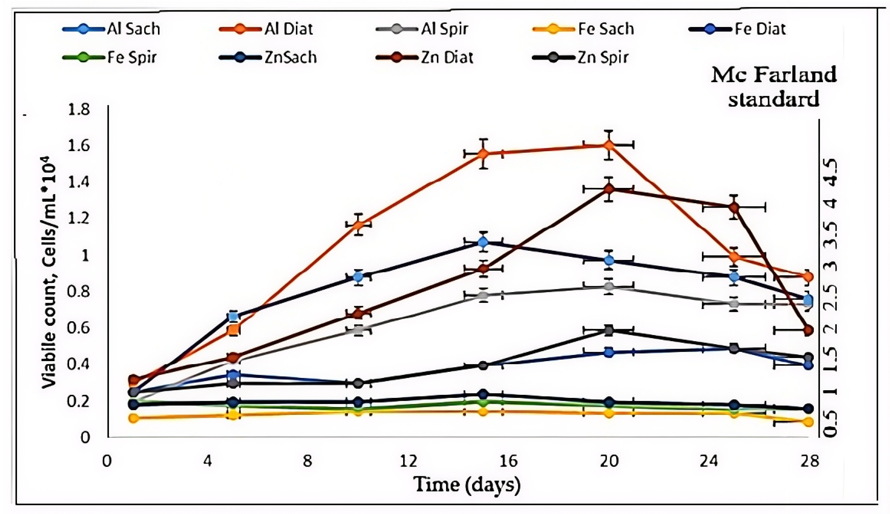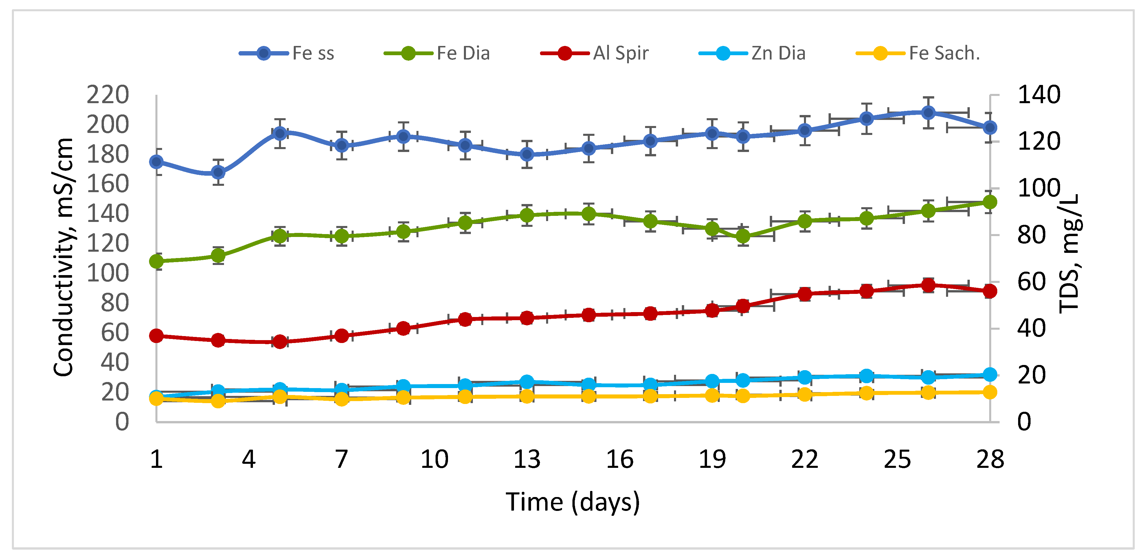 3.1. Physicochemical Parameters: The Evolution of pH, Dissolved Oxygen (DO) Content, Conductivity, Total Dissolved Solids (TDS), Measured in Biological Cultures of DSS in the Presence of Al, Zn, and Fe