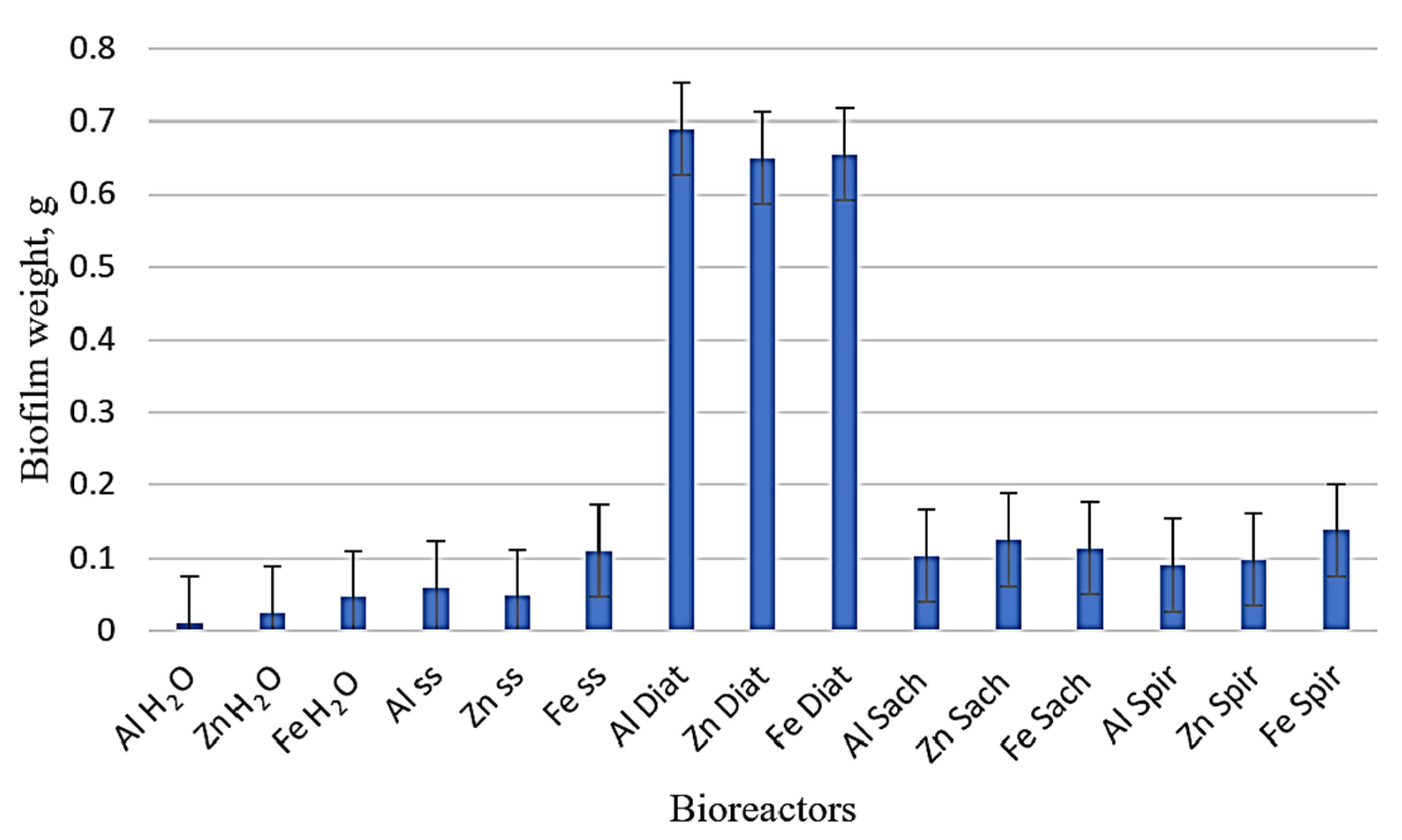- Diaconu, M.; Soreanu, G.; Balan, C.D.; Buciscanu, I.I.; Maier, V.; Cretescu, I. Study of Spirulina platensis (Arthrospira) development under the heavy metals influence, as a potential promoter of wastewater remediation. Water 2023, 15, 3962. [Google Scholar] [CrossRef]