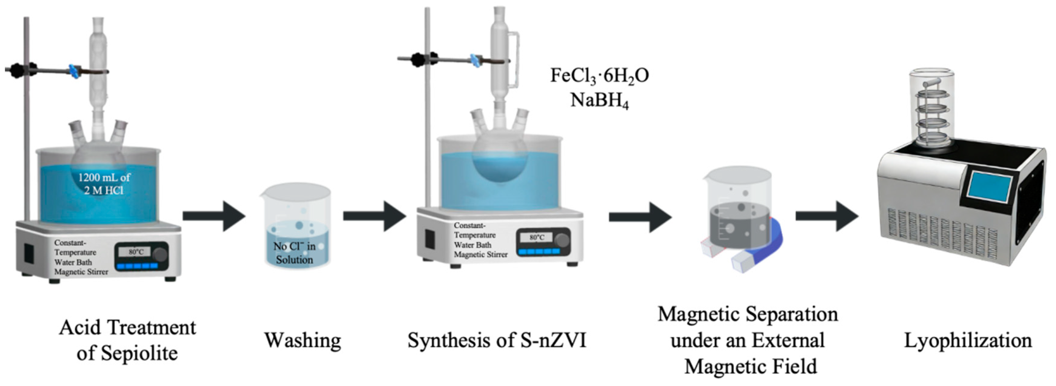 - Ainiwaer, M.; Zhang, T.; Yin, X.; Zhang, N.; Peng, L.; Li, H.; Zeng, X. Adsorption effect of Cd(II) by sepiolite-modified nanoscale zero-valent iron and mechanistic study. Environ. Chem. 2025, 44, 322–333. [Google Scholar] [CrossRef]