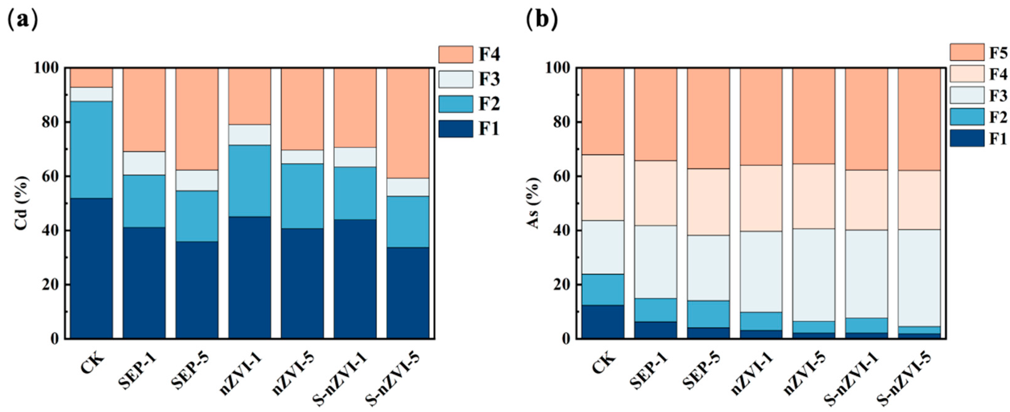 3.4. Effects on the Fractions of Cd and As in the Soil