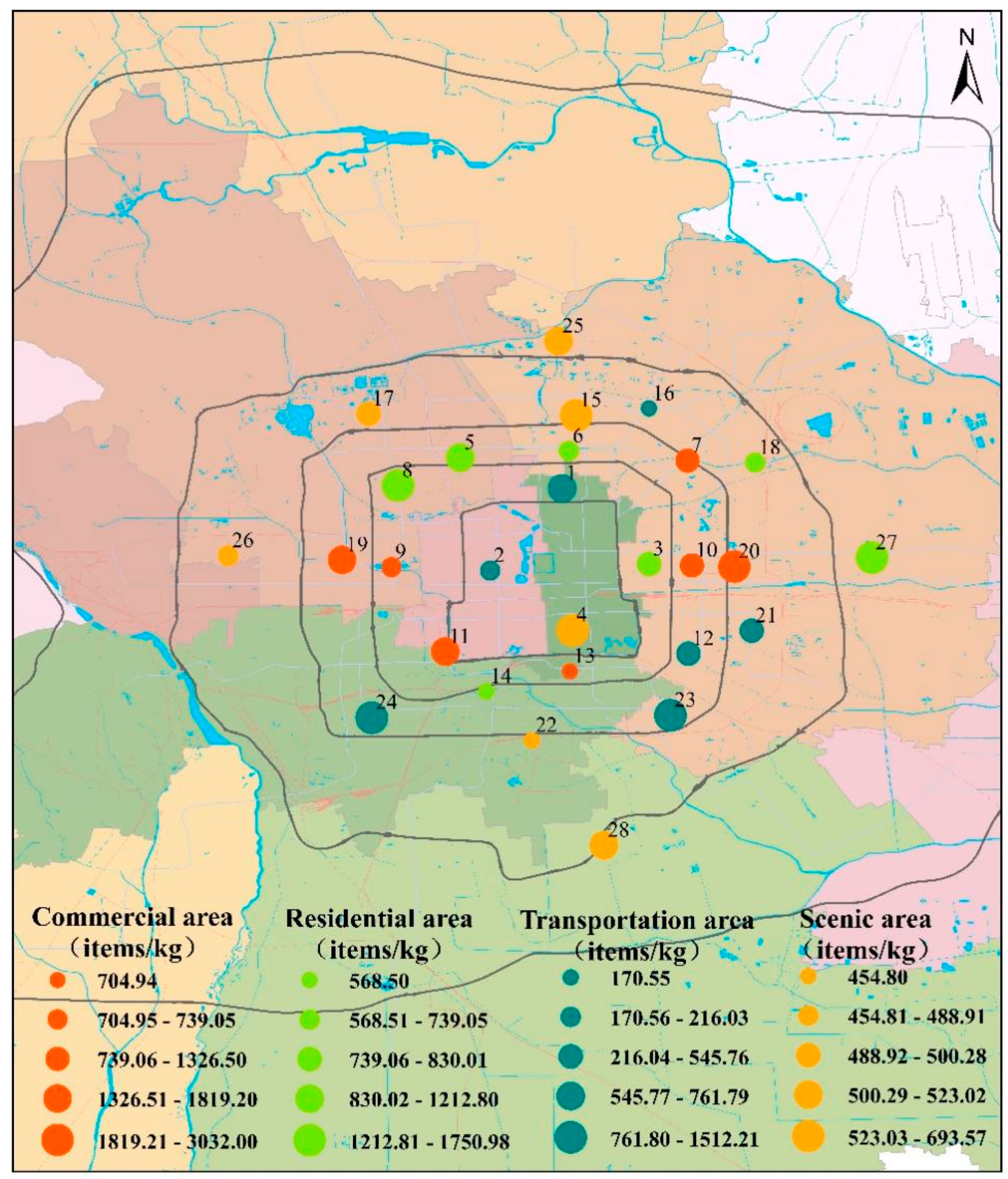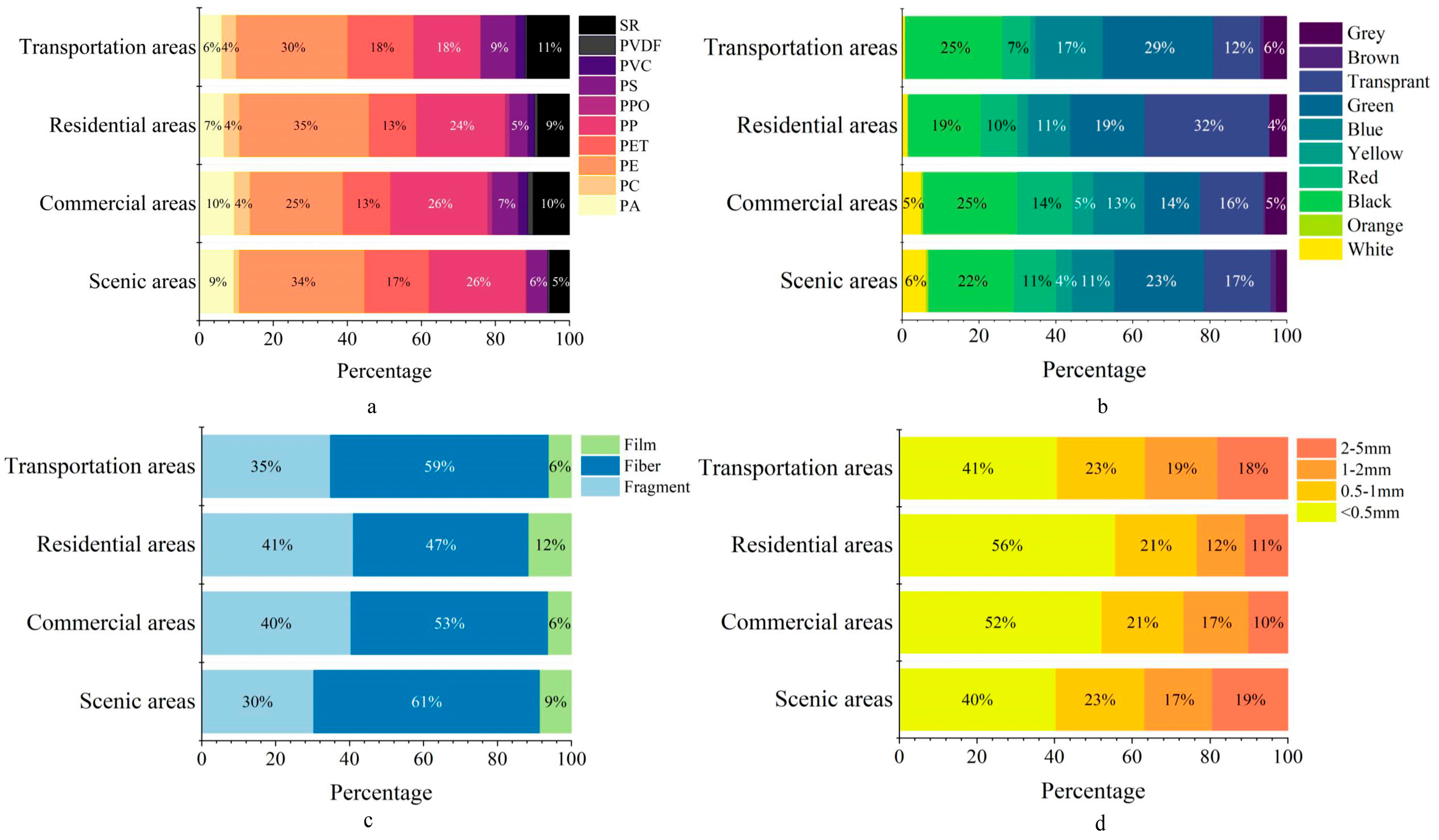 3.2. Abundance and Characterization of MPs in Different Functional Areas