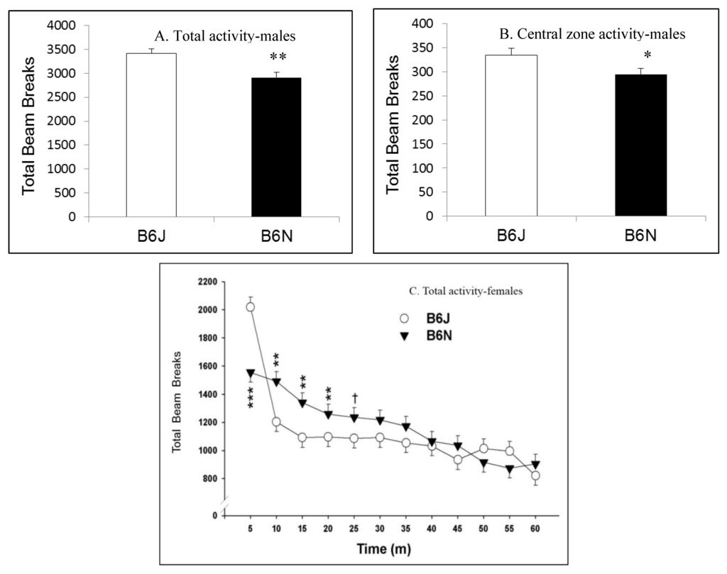 C57BL/6J male mice were significantly more active than C57BL/6N males when analyzing total beam breaks (Figure 1A) and activity in the central zone (Figure 1B). A different pattern was observed in female mice (Figure 1C). B6J females had higher activity in the first 5-min interval, but B6N females were more active during the next 20 min. This suggests that B6N females took longer to habituate to the test apparatus than the B6J females.