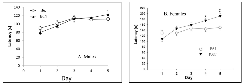 There were no significant differences on any of the five days of testing when B6J and B6N males were tested; however, B6N males had a greater percent increase in the latency to falling over the five-day test compared with B6J males (Figure 2A). B6N males improved 53% by Day 5, whereas B6J males only improved 24%. For female mice, there was a significant gene × day interaction (F4,122 = 4.97; p = 0.001) (Figure 2B). B6N females had a 76% increase in the latency to falling across the five days of testing compared with a 16% increase for B6J females.