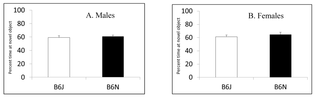 There were no significant differences in the percent of time exploring either of the familiarization objects (left vs. right object). During the test phase, there were no significant differences when comparing substrains B6 male (Figure 3A) or female (Figure 3B) performance. All groups of mice spent more time exploring the novel object in comparison to the familiar object, indicating that non-spatial learning and memory was normal.