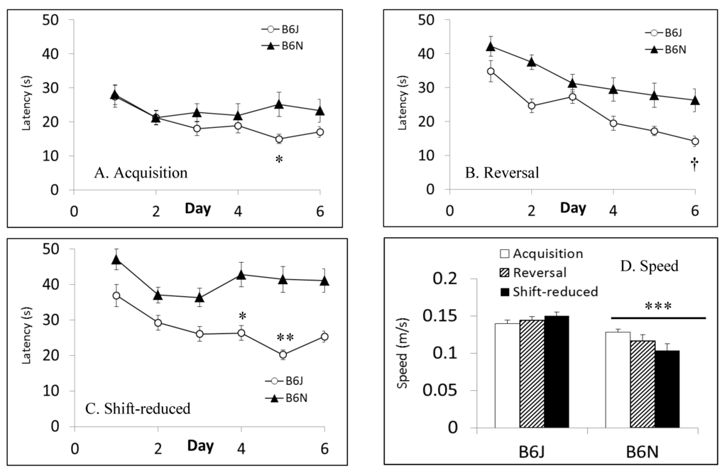 (A–D) Morris water maze: females. B6J females had significantly shorter latencies to finding the platform on Day 1 of the cued phase (p < 0.05). Path lengths were significantly different on Days 2–5 of the reversal phase and Days 2–4 of the shift-reduced phase with a trend on Day 5. † p < 0.1, * p < 0.05, ** p < 0.01, *** p < 0.001. Data are the least square means ± S.E.M.