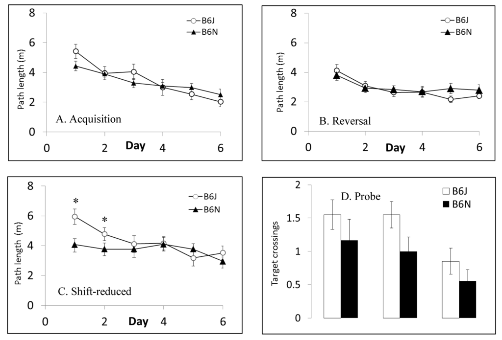 (A–D) Morris water maze path length: males. When analyzing path length, there were no significant differences in the acquisition or reversal phases, but a significant difference on Days 1–2 in the shift-reduced phase with shorter path lengths in B6N males. The number of target crossings during the probe trials was not significantly different for males in any of the three phases. * p < 0.5. Data are the least square means ± S.E.M.