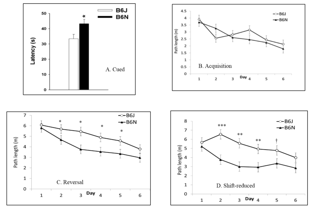 | Morris water maze | Spatial learning and memory | Shorter latencies to escape in B6J; faster swim speeds in B6J; shorter path lengths in shift-reduced in B6N | Shorter path lengths in reversal and shift-reduced in B6N; faster swim speeds in B6J |