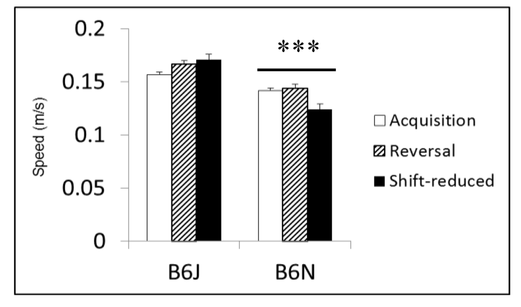 B6J females had shorter latencies on Day 1 of cued platform testing (Figure 6A) compared with B6N females, but there were no other significant differences in latency to find the platform on Days 2–6 in cued or in any of the three hidden platform phases (data not shown). There was a significant main effect of day in all four phases (p < 0.001). When path lengths were compared, there were no significant difference during the acquisition phase (Figure 6B). However, B6N females had significantly shorter path lengths during the more challenging reversal and shift-reduced phases (F1,122 = 14.34; p < 0.001) (Figure 6C,D). B6N females had significantly more platform crossings in the acquisition probe trial (F1,38 = 16.21; p < 0.0001), but there were no significant differences in the probe trials for reversal and shift-reduced (data not shown). Swim speeds were similar in females, with B6J mice swimming faster than B6N females (Figure 7).