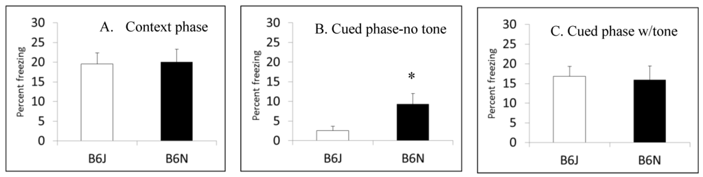 There was no significant difference in the percent of time spent freezing between the B6J and the B6N males during the training phase (data not shown) or the context phase test (Figure 8A). Prior to the onset of the tone in the cued phase, the B6N males spent a significantly longer time freezing (Figure 8B) than the B6J males (p < 0.05). There was no significant difference between the percent time freezing between the two substrains during the cued phase (Figure 8C).