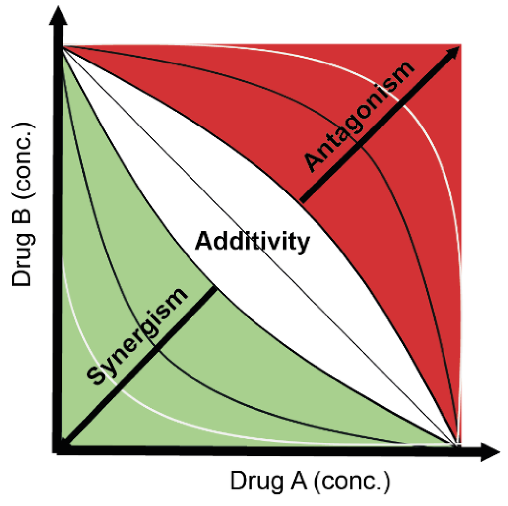 In the context of the above definitions, toxicological interactions such as synergism and antagonism may be considered as departures from additivity. Berenbaum [] already described synergism as the situation where the effect of a drug combination is greater than expected, and antagonism as the situation in which the combination response is less than expected and no or zero interaction as the situation where the drug combination effect is as expected. He also referred to zero interaction as additivity but advised that the term does not imply anything about how the operation of addition is performed. Goldin and Mantel [] described synergism or antagonism when the potency of the mixture/combination is greater or less than can be accounted by the potencies of the individual drugs. When the combination effect is as expected (consistent with the individual drug potencies), the interaction is then additive.