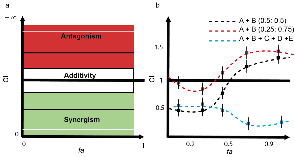Software CompuSyn [] (Combosyn Inc., Paramus, NJ, USA) was developed for calculation of dose-effect curve parameters, CI values, conventional isobolograms, fa-CI plot (plot representing CI versus fa, the fraction affected by a particular dose; see Equation (8)), and polygonograms (a polygonal graphic representation depicting synergism, additive effect and antagonism for three or more drug combinations). The fa-CI plot, as an effect-oriented graphic, complements the isobole, which is a dose-oriented graphic and allows showing the interaction between drugs in a combination at all effect levels simultaneously. Figure 2a shows the schematic representation of the location of additivity, synergism, and antagonism in the fa-CI plot. Different mixture ratios, different binary mixtures or multicomponent mixtures without any limitation regarding the number of components can be drawn in the fa-CI plot (Figure 2b).
