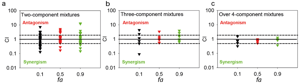 CI values of two-component mixtures (n = 63) (a); three-component mixtures (n = 21) (b) over four-component mixtures (n = 18), (c) at three representative effect levels fa (0.1, 0.5, 0.9 ) for a variety of pollutant combinations, such as heavy metals, herbicides, perfluorinated surfactants, and pharmaceuticals, elaborated based on the data published in Rodea-Palomares et al. [,,], Rosal et al. [] and Gonzalez-Pleiter et al. []. CI axis in logarithmic scale. Straight lines represent additivity, broken lines indicate suggested limits for significant departures from additivity (CI = 2 as upper limit for antagonism, CI = 0.5 as upper limit for synergism).