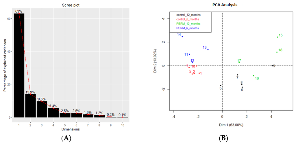 The Scree plot in Figure 1A, shows the contribution of the first ten eigenvalues: the first three eigenvalues are responsible for more than 85% of the explained variance (the detailed values are in Table 1). In the PCA plot (Figure 1B), it is possible to observe four different clusters corresponding to control and PERM at six and 12 months. The temporal distinction of clusters (red and blue marks against black and green ones) is clear; in addition, a clear separation between control and PERM groups can be observed at six months. On the contrary, at 12 months, the difference between both groups (black and green marks) cannot be precisely detected.