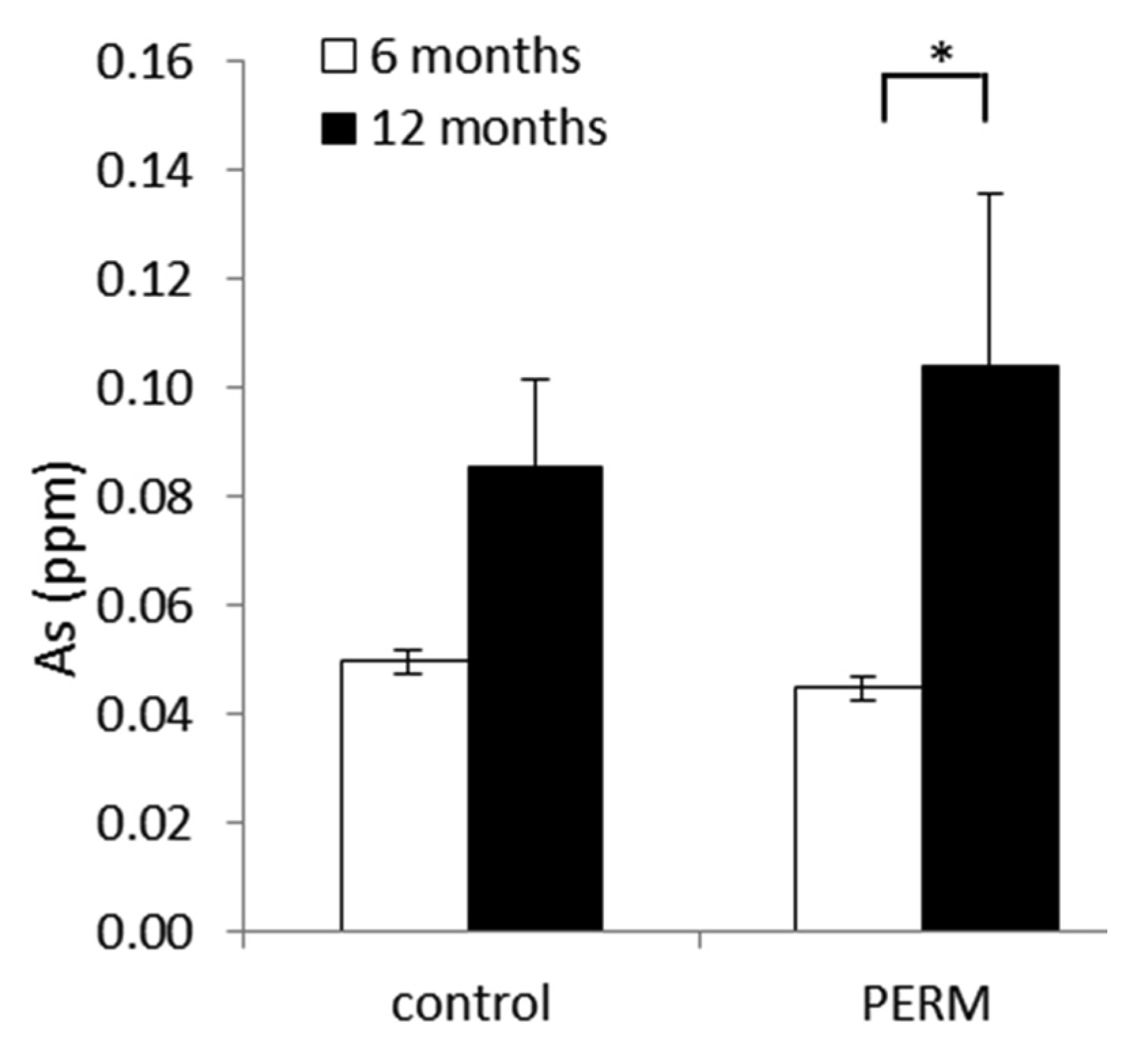 Analysis of As in hair from early life PERM-treated rats and control ones at six and 12 months of age. Data are expressed as the mean values ± SEM. * p < 0.05.