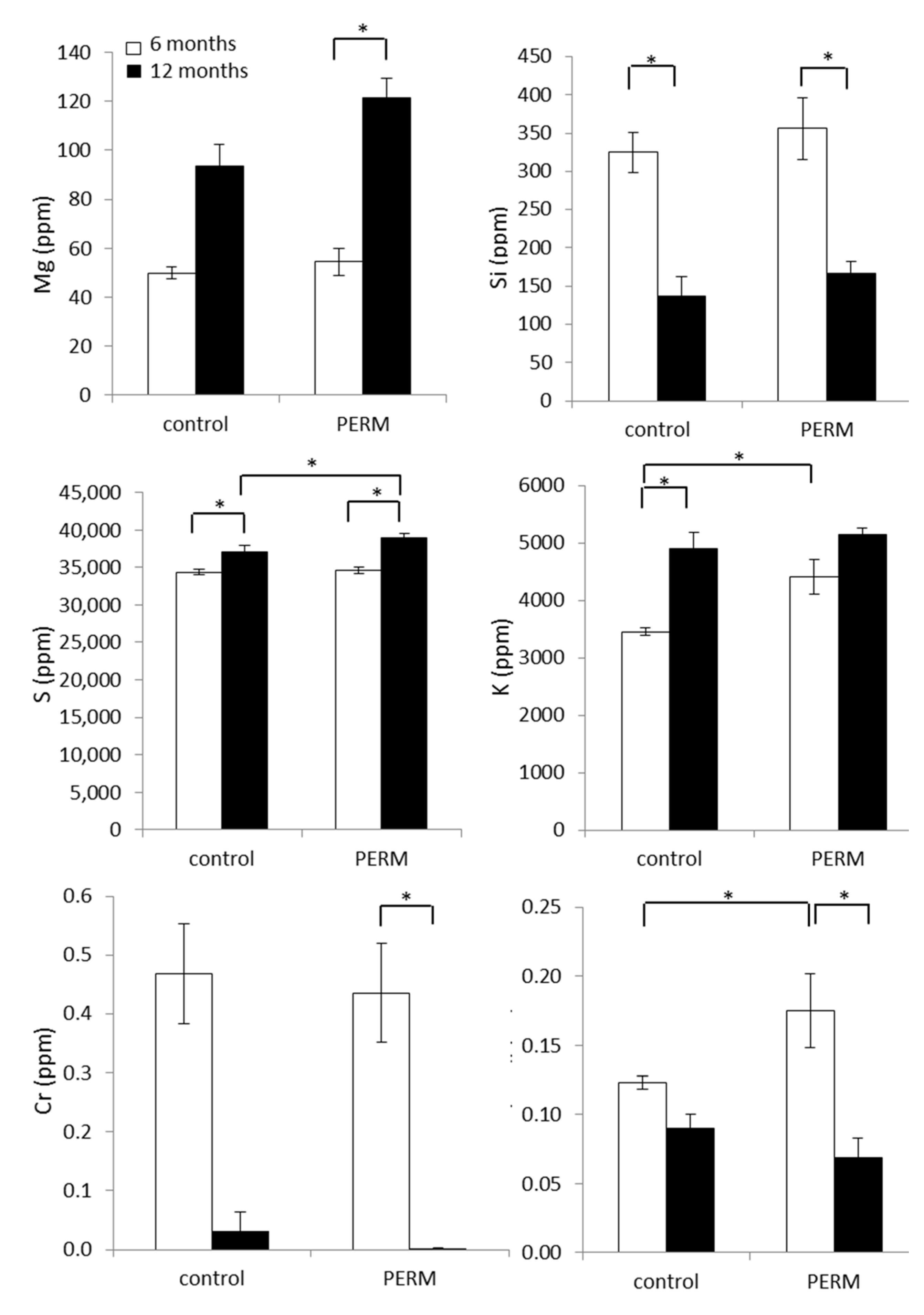 Other microelements were significantly modified by early life exposure to PERM (Figure 3). Within the PERM group, Mg was increased at 12 months of age compared to six months of age (H [3,18] = 13.49, p = 0.0037), as well as S was higher than that measured in the matched control group at the same age as revealed by a significant treatment × time interaction, F [1,7] = 31.69, p = 0.00079.