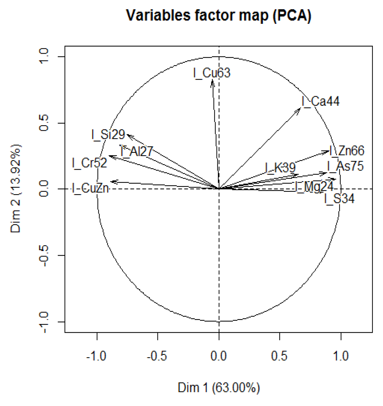 PCA analysis on metals and microelements that were significantly changed showed two clusters (Figure 4). In particular, the variable factor map indicates that PC1 (Dim1) was correlated with all microelements except Cu. All microelements on the right of the picture were negatively correlated with those in the left of the map, except for Cu, associated with PC2 (Dim2), which was negatively correlated with Ca.