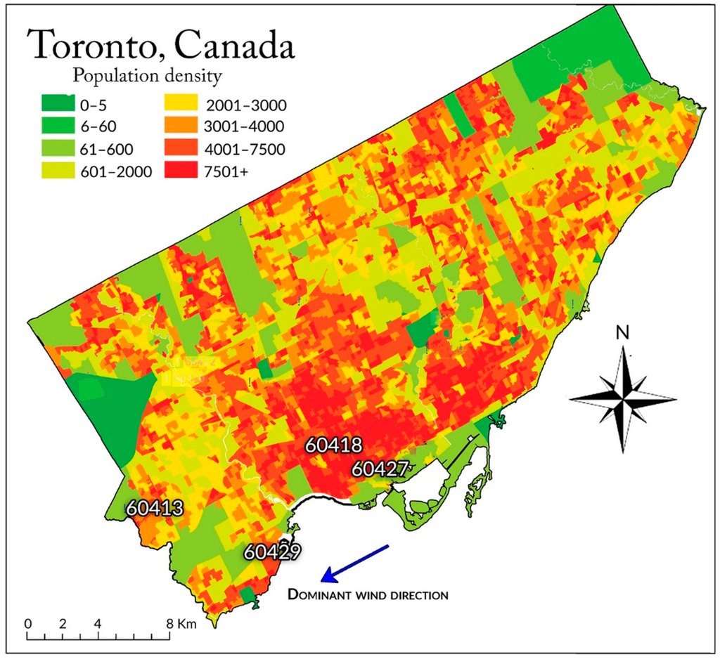 Toronto, Canada: population density and locations of four monitors used in the study.
