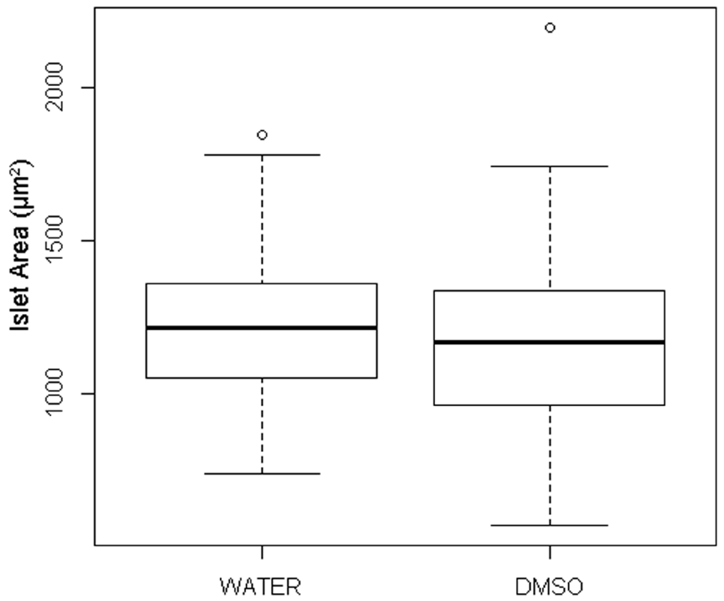 Embryos grown in dimethyl sulfoxide (DMSO) have similar islet sizes to embryos grown in water only. Islet areas were measured at 96 hpf in embryos raised in eggwater or in 0.01% DMSO, renewed daily. There was no significant difference in median area (p = 0.17) or distribution of islet areas between these control groups, though the range of islet areas for DMSO controls was slightly larger due to a high statistical outlier in the DMSO group (n = 44 embryos for the water group, and 72 for DMSO).