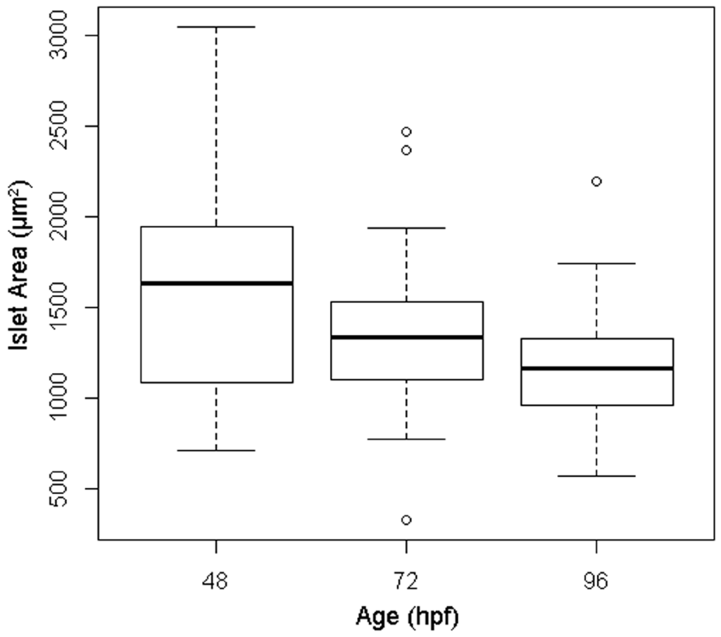 Islet size and variability changes over time during development in DMSO treated embryos. Islet size was measured at 48, 72, and 96 h post fertilization in embryos maintained in 0.01% DMSO, renewed daily Variability decreased between 48–96 hpf with the decreasing size of the islets, and assumed a more normal distribution. The highest range of area measures was observed at 48 hpf, while the lowest area variability was found at 96 hpf. The characteristic (normal) decrease in islet size from 48 to 72 hpf was not significant (p = 0.06), though the total decrease from 48 to 96 hpf was statistically significant (p < 0.001); n = 68, 42, or 72 embryos for 48, 72, and 96 hpf respectively.