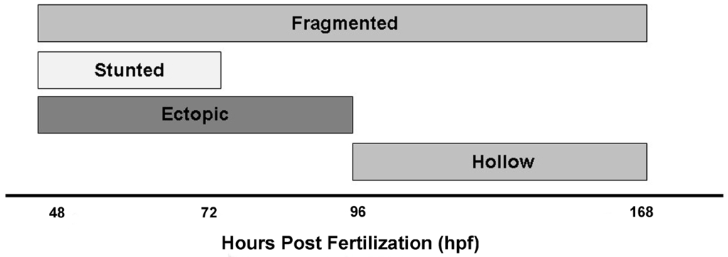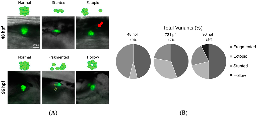 We identified specific windows of development during which particular islet variants appear (Figure 8). The most common variant observed, fragmented islets, occur throughout the entire window of embryonic development studied. However, stunted, ectopic, and hollow islets only exist during specific ranges. Stunted islets have only been observed in studies through 72 hpf, but none are visible at 96 hpf. Ectopic cells are only witnessed in our model through 96 hpf. Hollow islets are not observed prior to 96 hpf. The timing of these morphologies should be considered for toxicological studies, as some toxicants may only predispose embryos to specific variant morphologies. In this study, we did not observe any islet migration defects, such as those we identified previously with exposure to PCB-126. In that study, at 96 hpf, we observed the islet had migrated anteriorly, aligning with the third somite instead of the fourth, in addition to hypomorphic islets, fragmented islets, and ectopic beta cells [14].